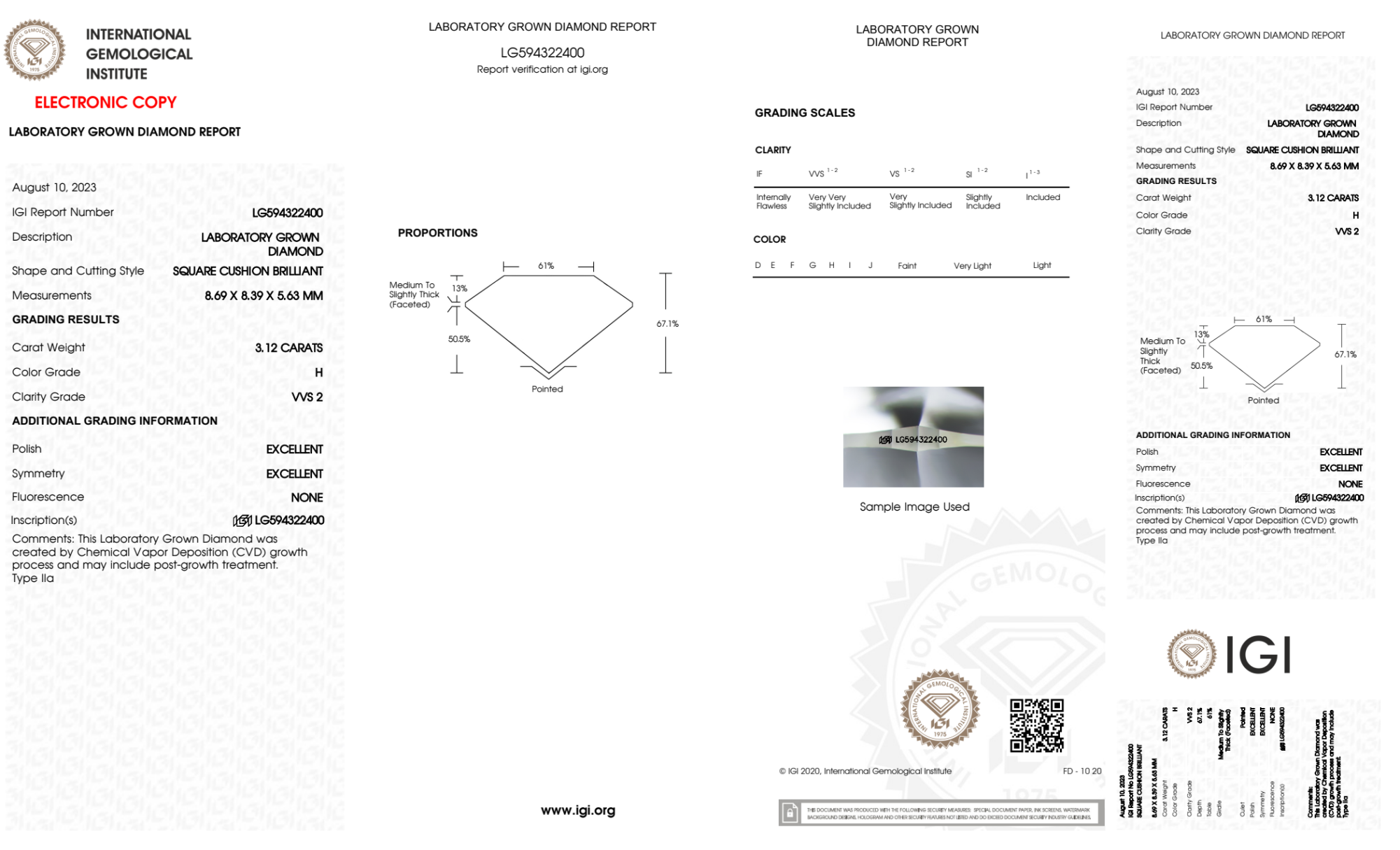 Your 3.12 carat Cushion lab diamond is graded H color (Near Colorless), and you can read more about H color diamonds here.