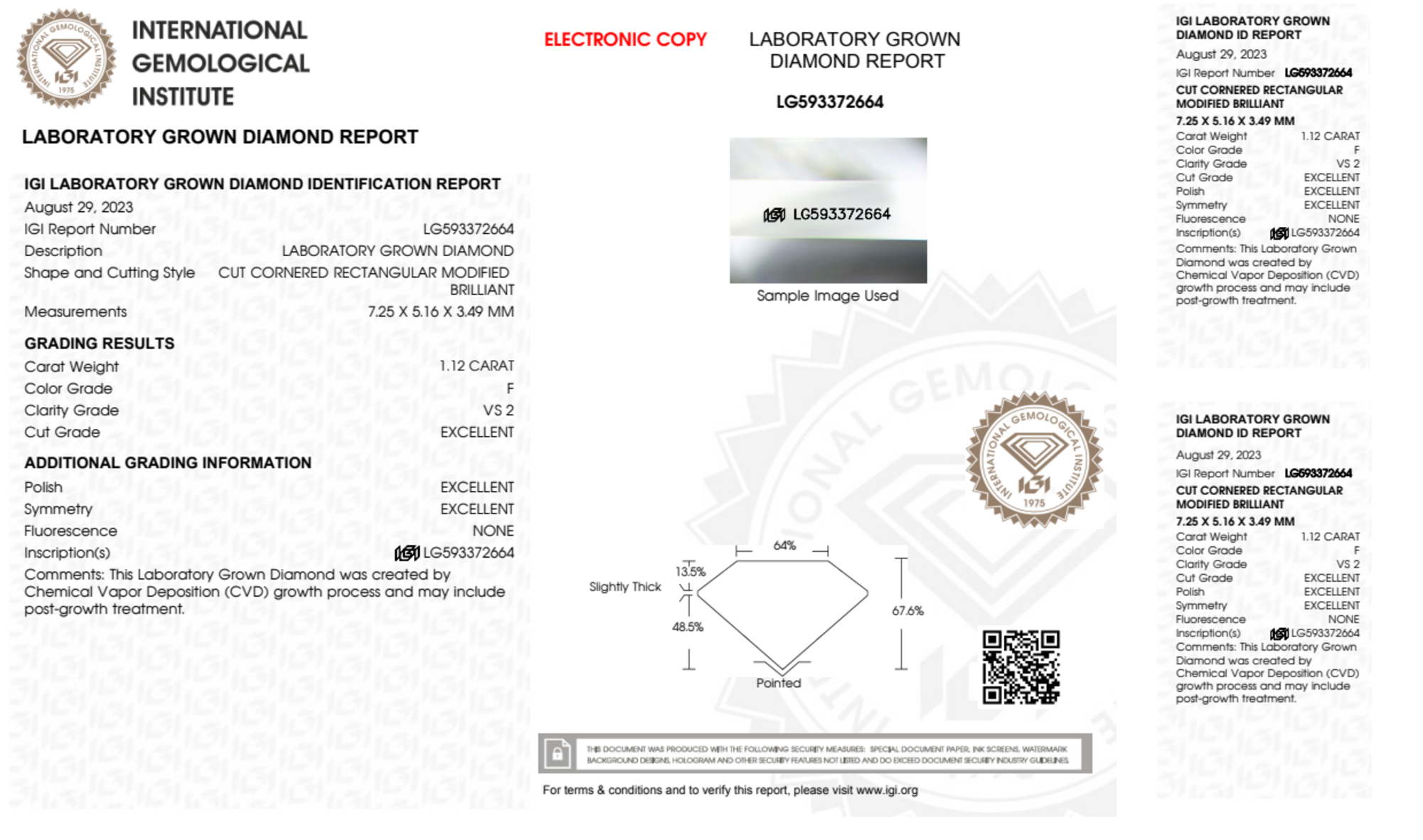 Your 1.12 carat Radiant lab diamond is graded F color (Colorless), and you can read more about F color diamonds here.