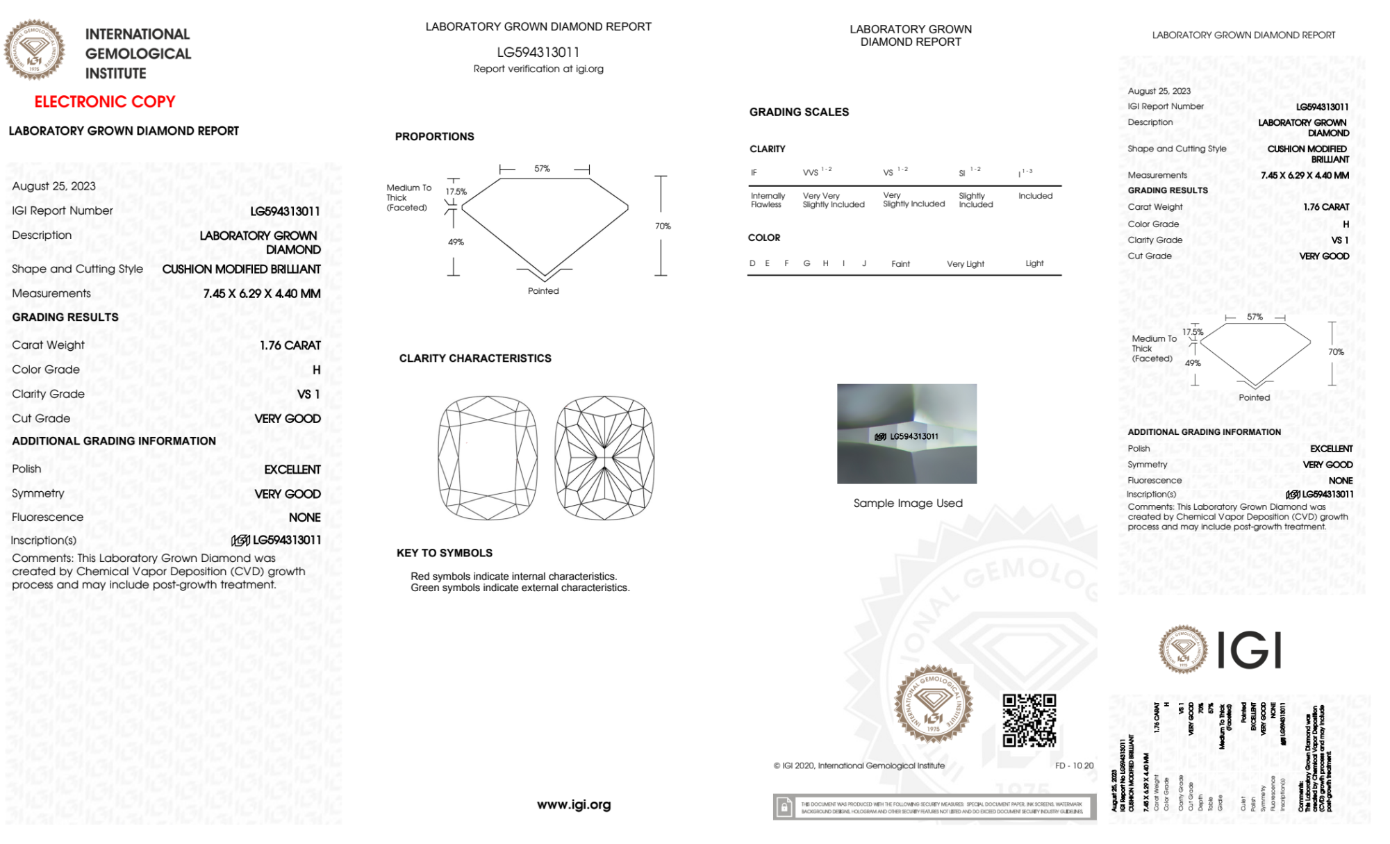 Your 1.76 carat Cushion lab diamond is graded H color (Near Colorless), and you can read more about H color diamonds here.
