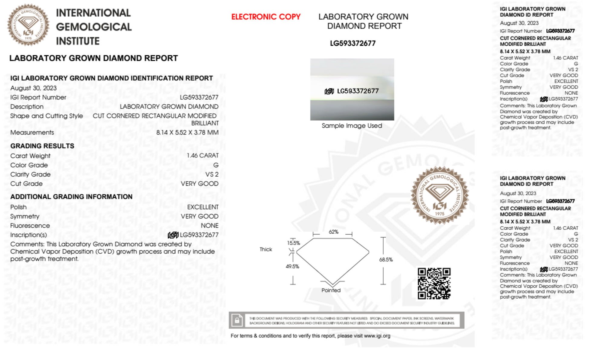Your 1.46 carat Radiant lab diamond is graded G color (Near Colorless), and you can read more about G color diamonds here.