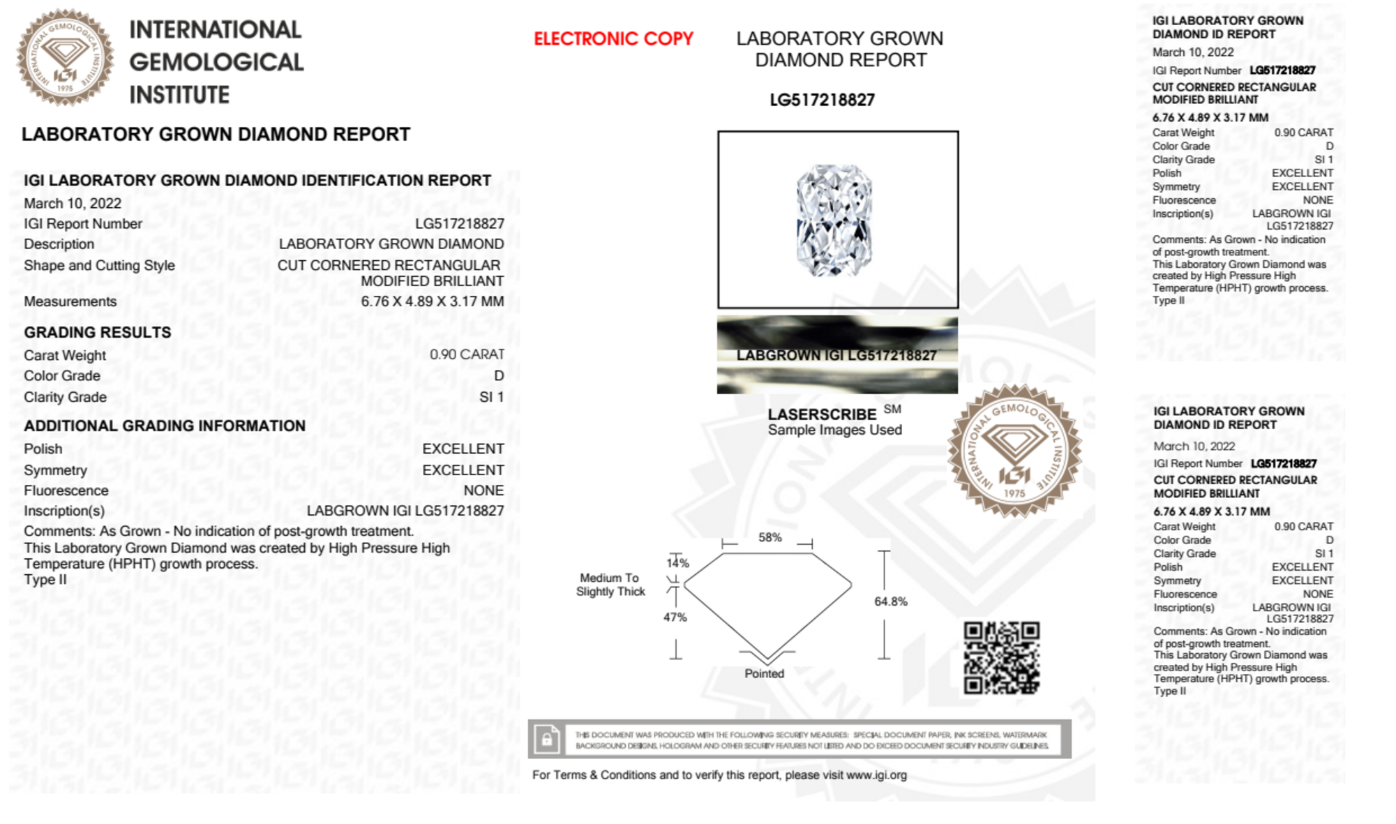 Your 0.90 carat Radiant lab diamond is graded D color (Colorless), and you can read more about D color diamonds here.