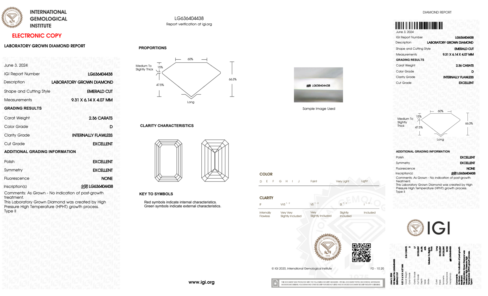 Your 2.36 carat Emerald lab diamond is graded IF clarity, which stands for Internally Flawless. Read more about IF clarity diamonds here, or learn more about diamond clarity in general here.