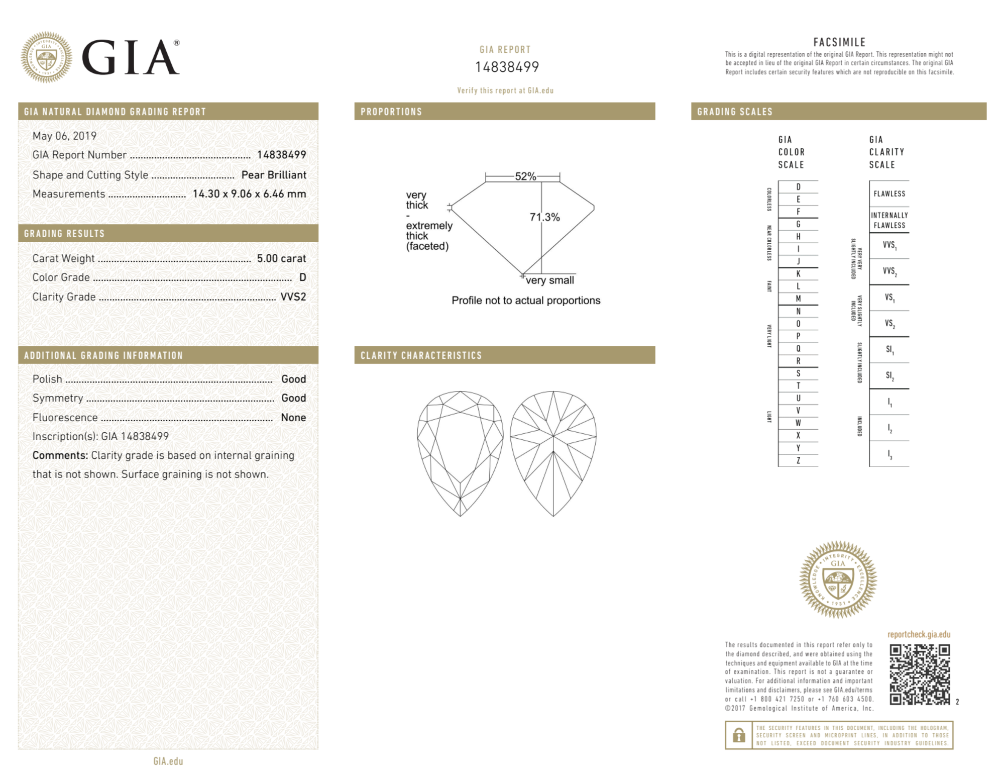 Your 5.00 carat Pear natural diamond is graded D color (Colorless), and you can read more about D color diamonds here.