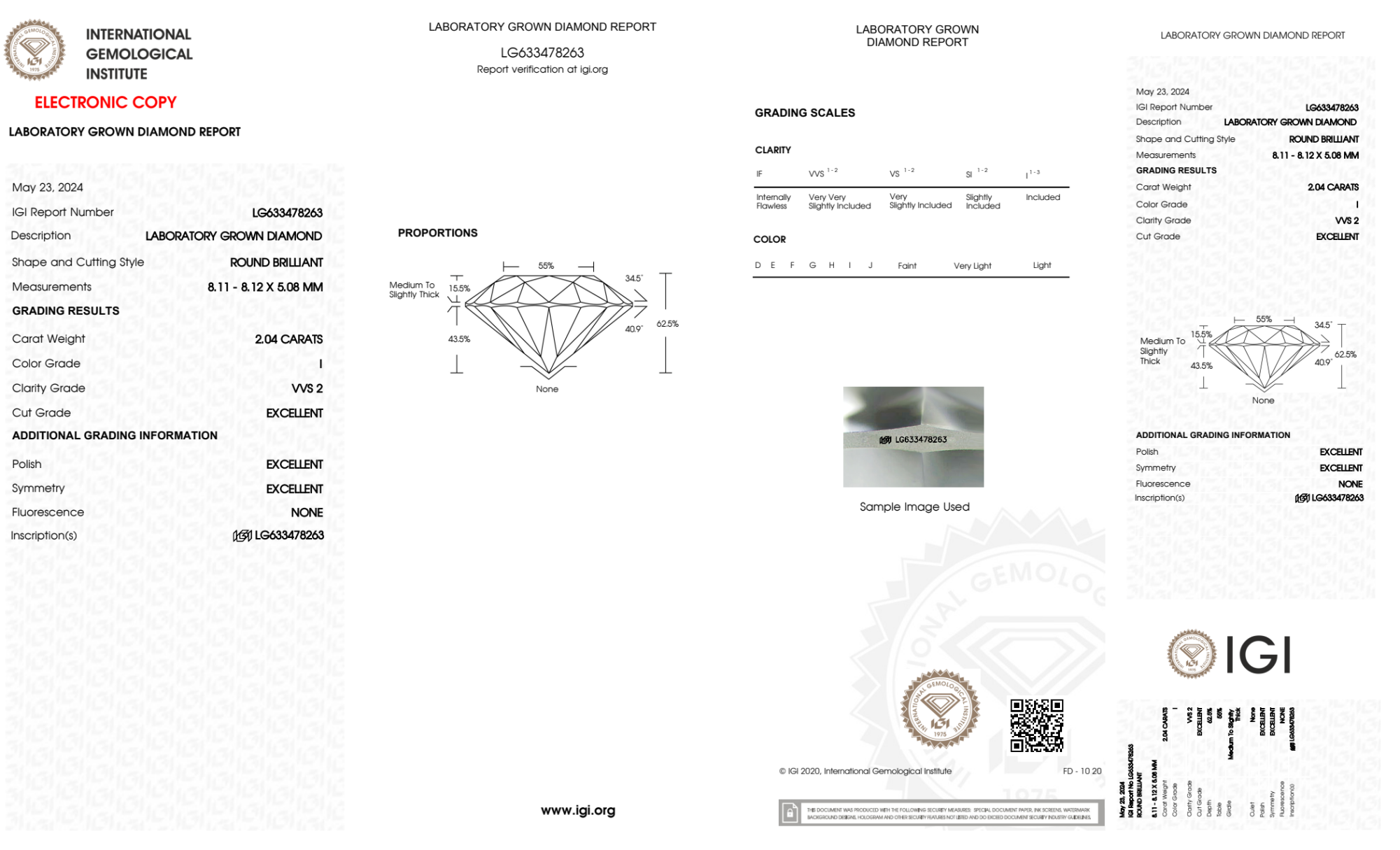 Your 2.04 carat Round lab diamond is graded I color (Near Colorless), and you can read more about I color diamonds here.