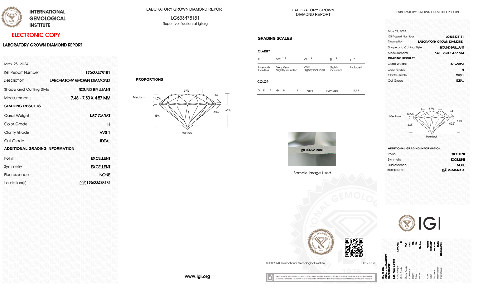 Your 1.57 carat Round lab diamond is graded VVS1 clarity, which stands for Very Very Slightly Included 1. Read more about VVS1 clarity diamonds here, or learn more about diamond clarity in general here.