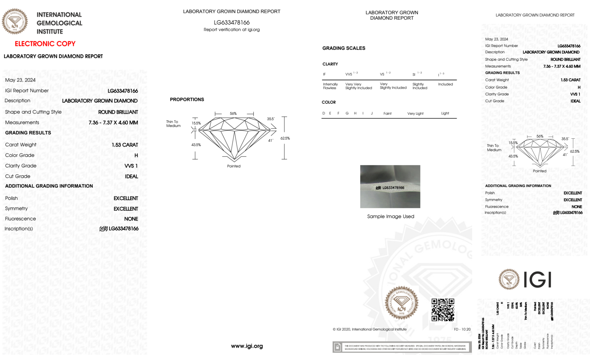 Your 1.53 carat Round lab diamond is graded H color (Near Colorless), and you can read more about H color diamonds here.