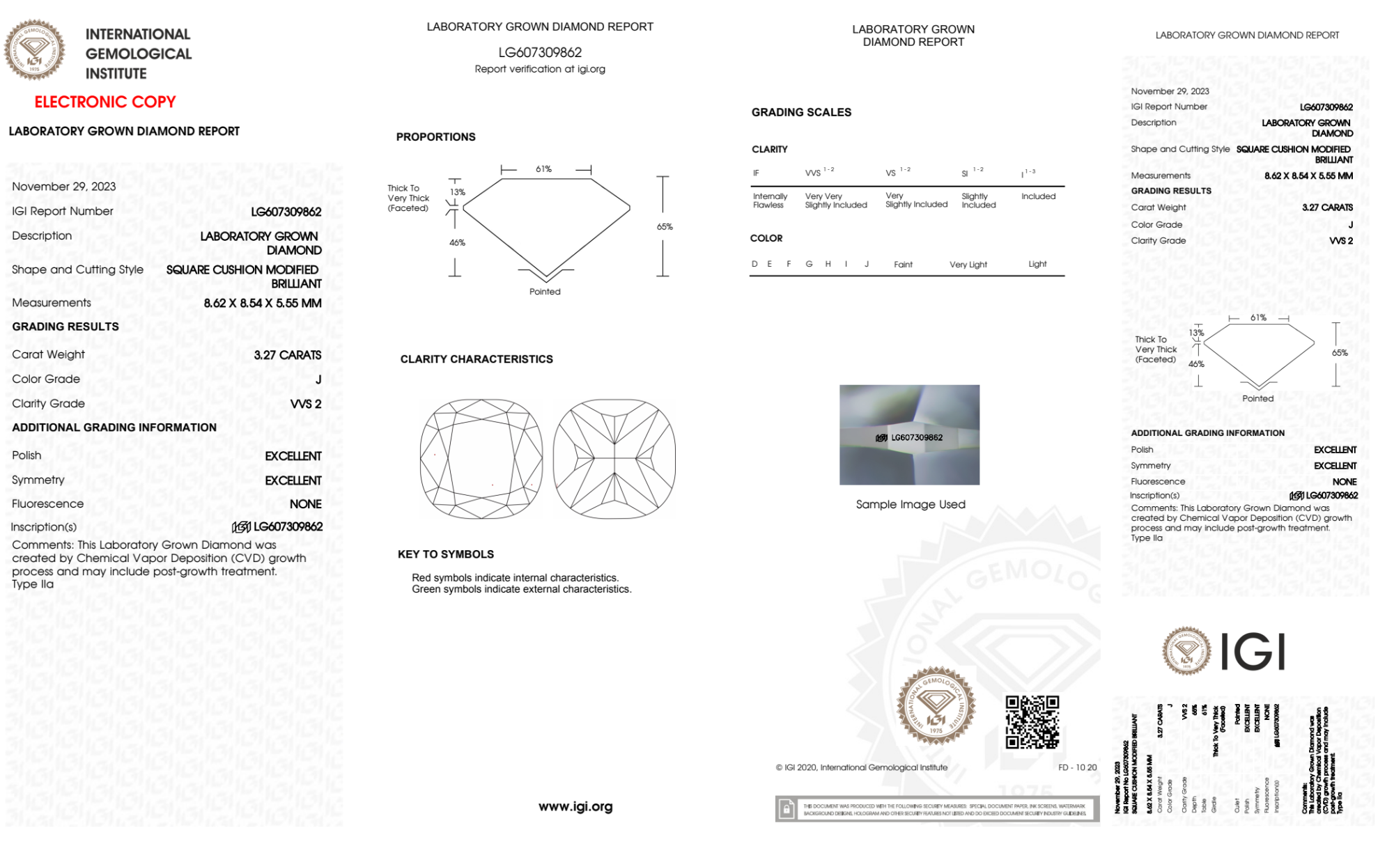 Your 3.27 carat Cushion lab diamond is graded J color (Near Colorless), and you can read more about J color diamonds here.