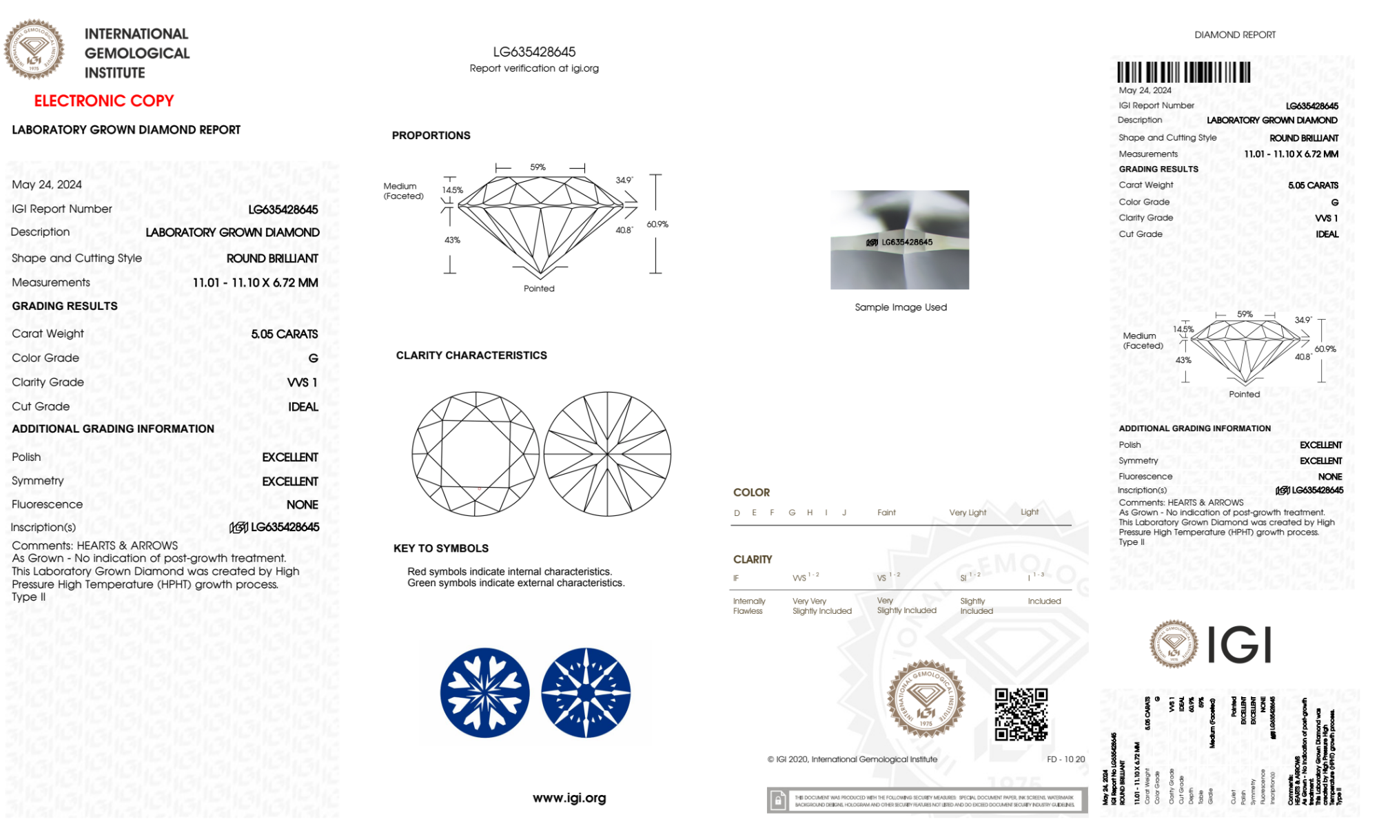 Your 5.05 carat Round lab diamond is graded VVS1 clarity, which stands for Very Very Slightly Included 1. Read more about VVS1 clarity diamonds here, or learn more about diamond clarity in general here.