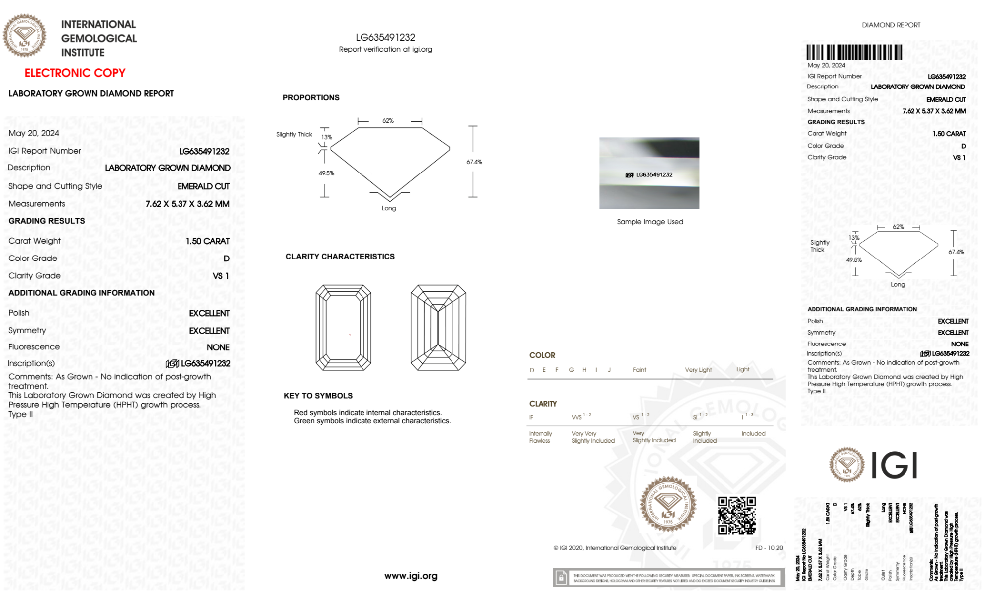 Your 1.50 carat Emerald lab diamond is graded D color (Colorless), and you can read more about D color diamonds here.