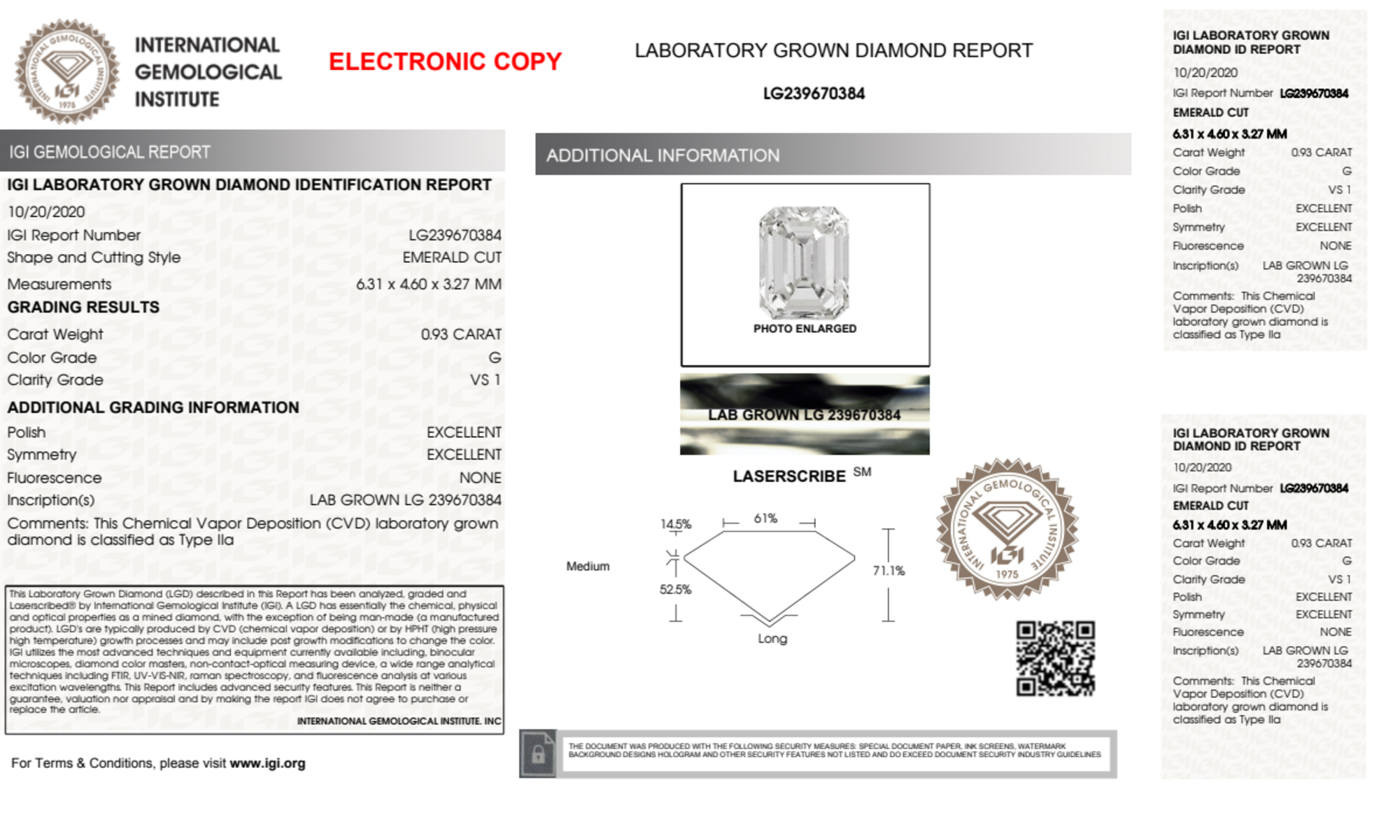 Your 0.93 carat Emerald lab diamond is graded G color (Near Colorless), and you can read more about G color diamonds here.