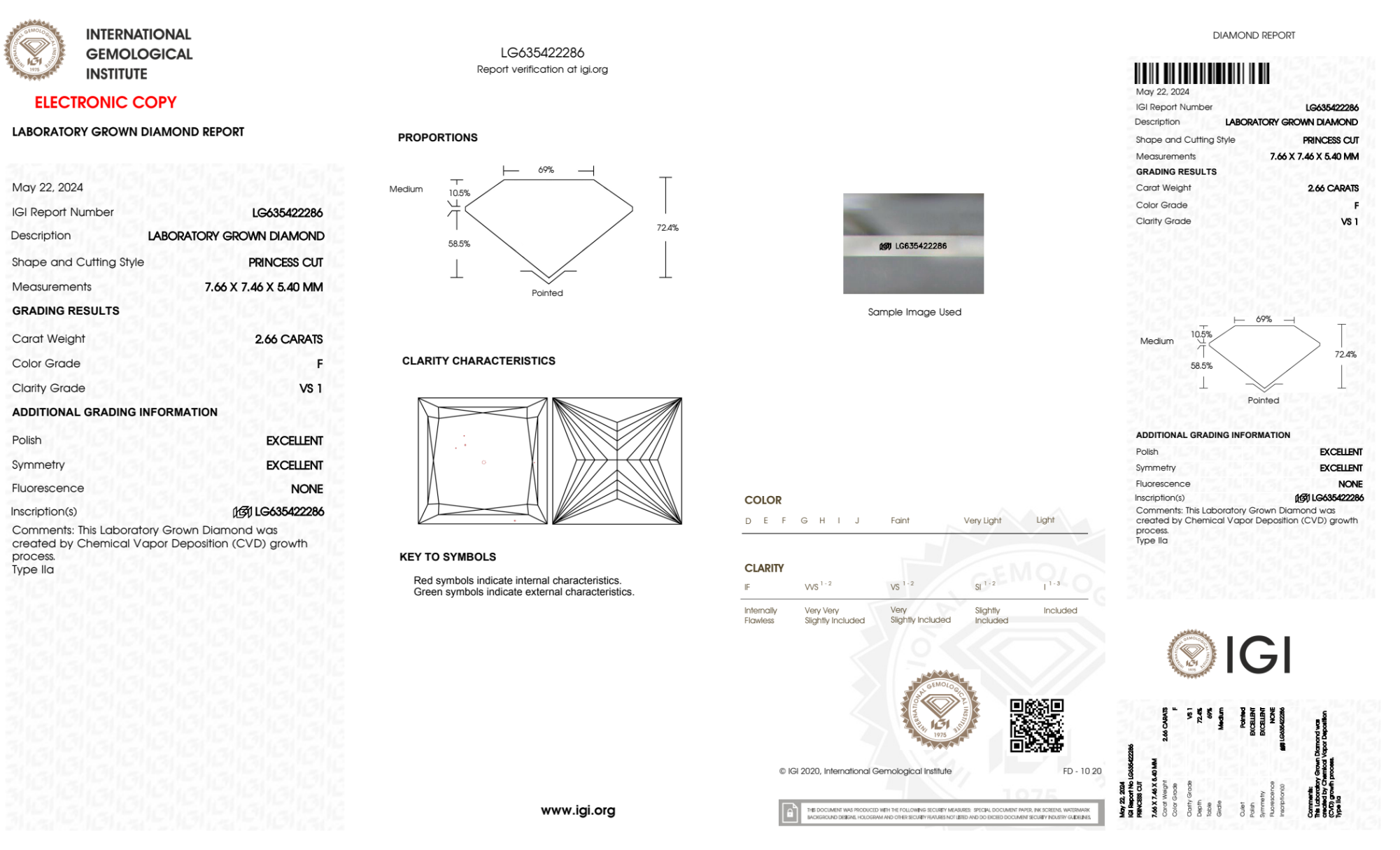Your 2.66 carat Princess lab diamond is graded VS1 clarity, which stands for Very Slightly Included 1. Read more about VS1 clarity diamonds here, or learn more about diamond clarity in general here.