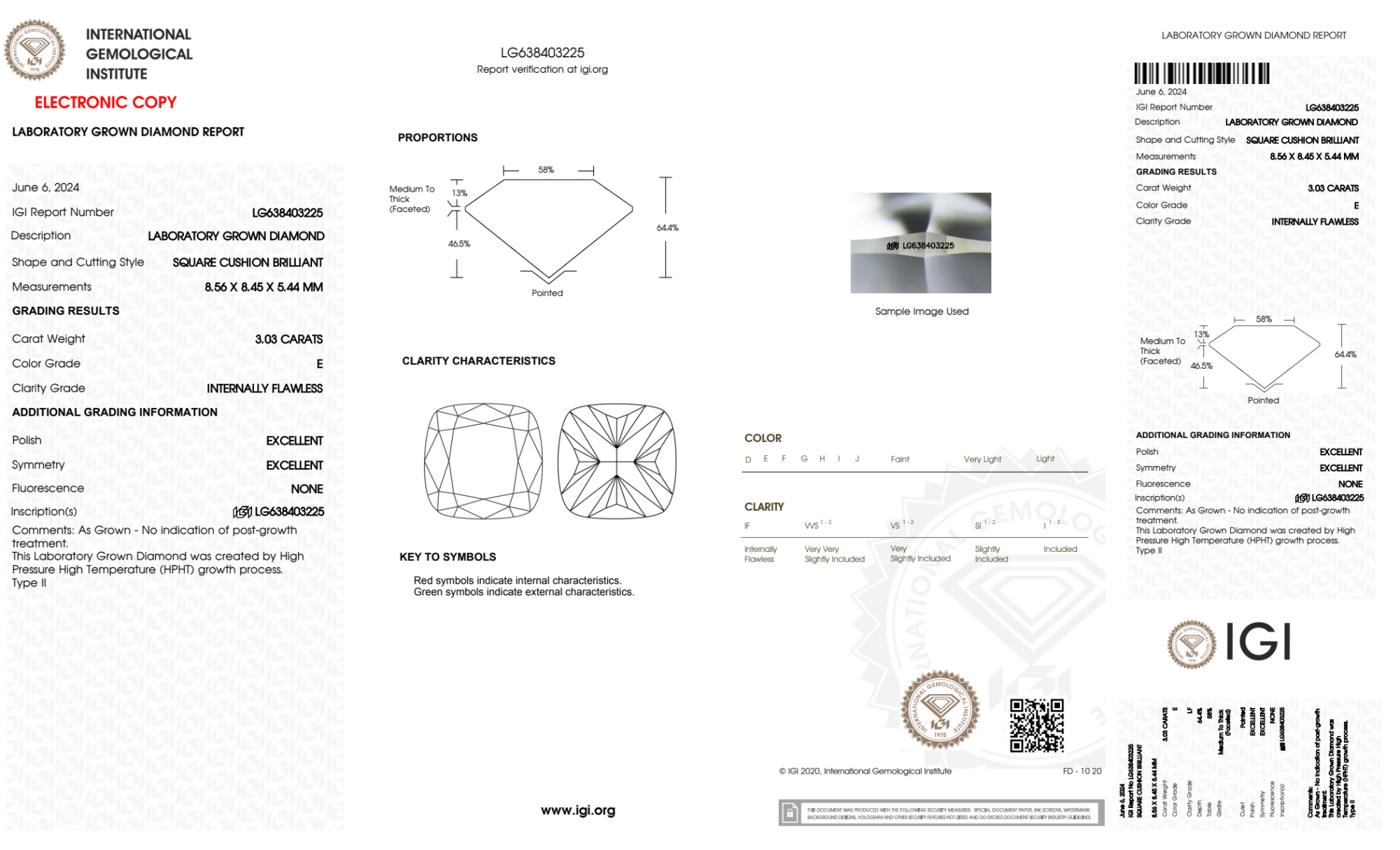 Your 3.03 carat Cushion lab diamond is graded E color (Colorless), and you can read more about E color diamonds here.