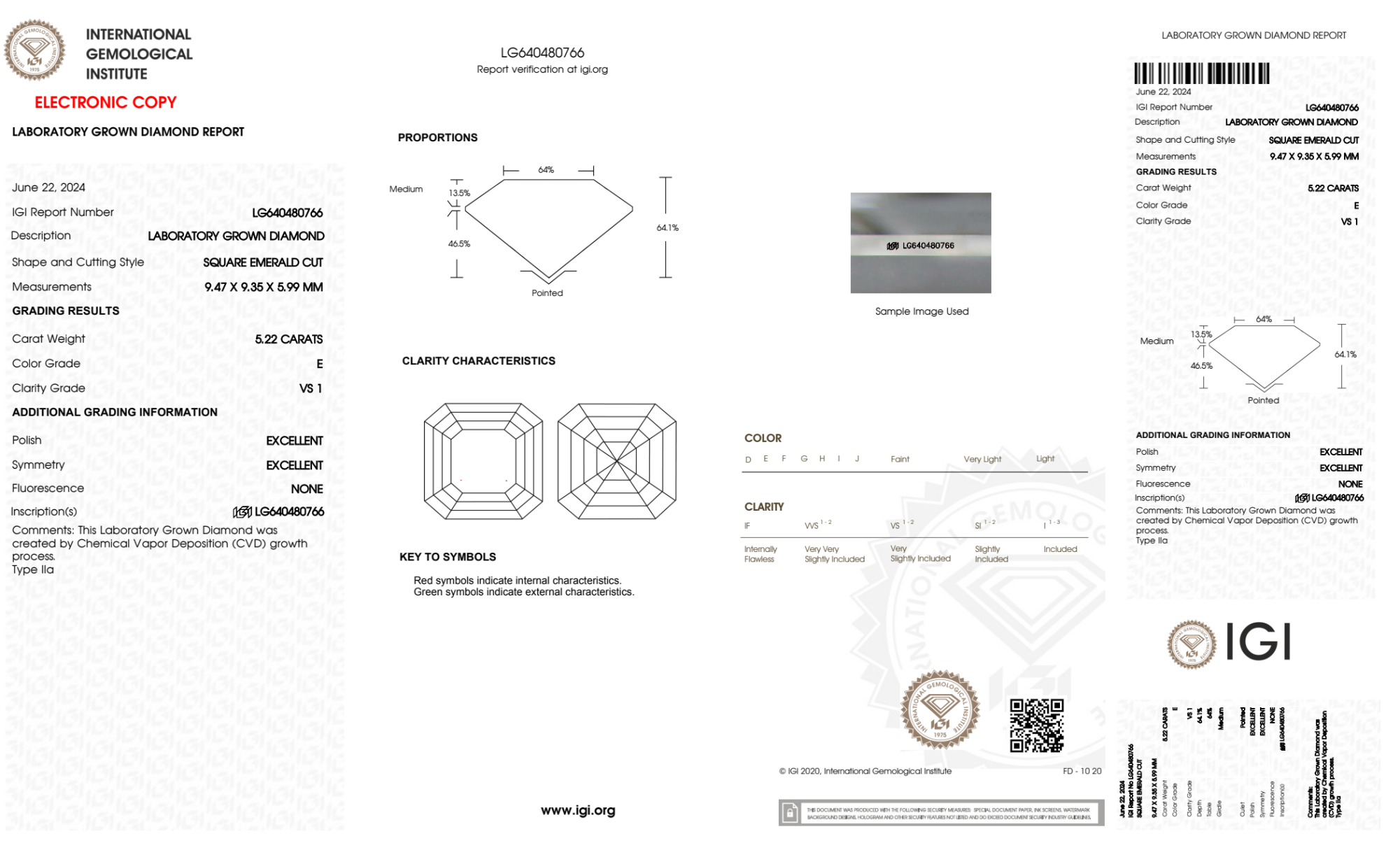 Your 5.22 carat Asscher lab diamond is graded E color (Colorless), and you can read more about E color diamonds here.