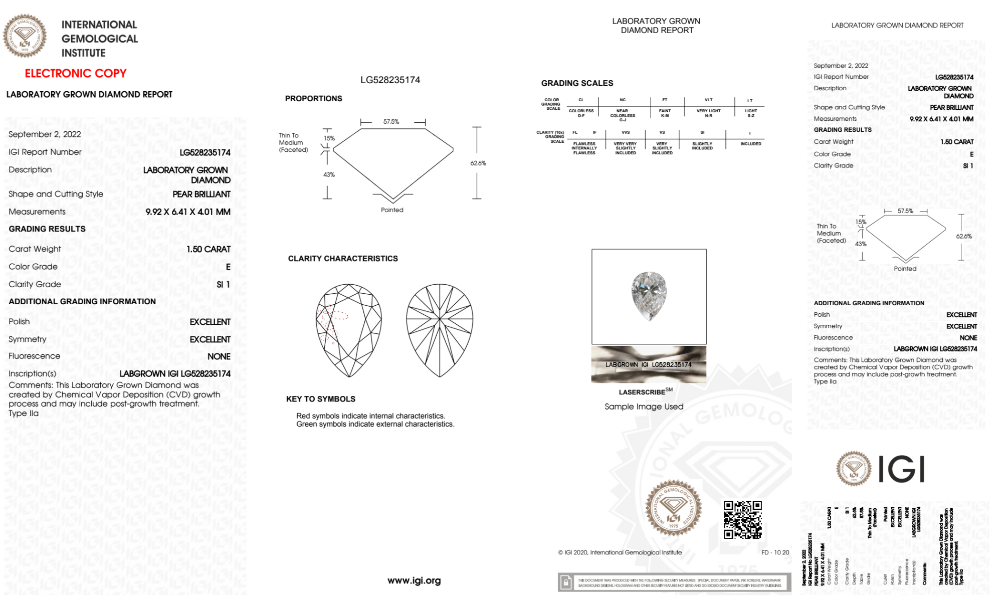 Your 1.50 carat Pear lab diamond is graded E color (Colorless), and you can read more about E color diamonds here.