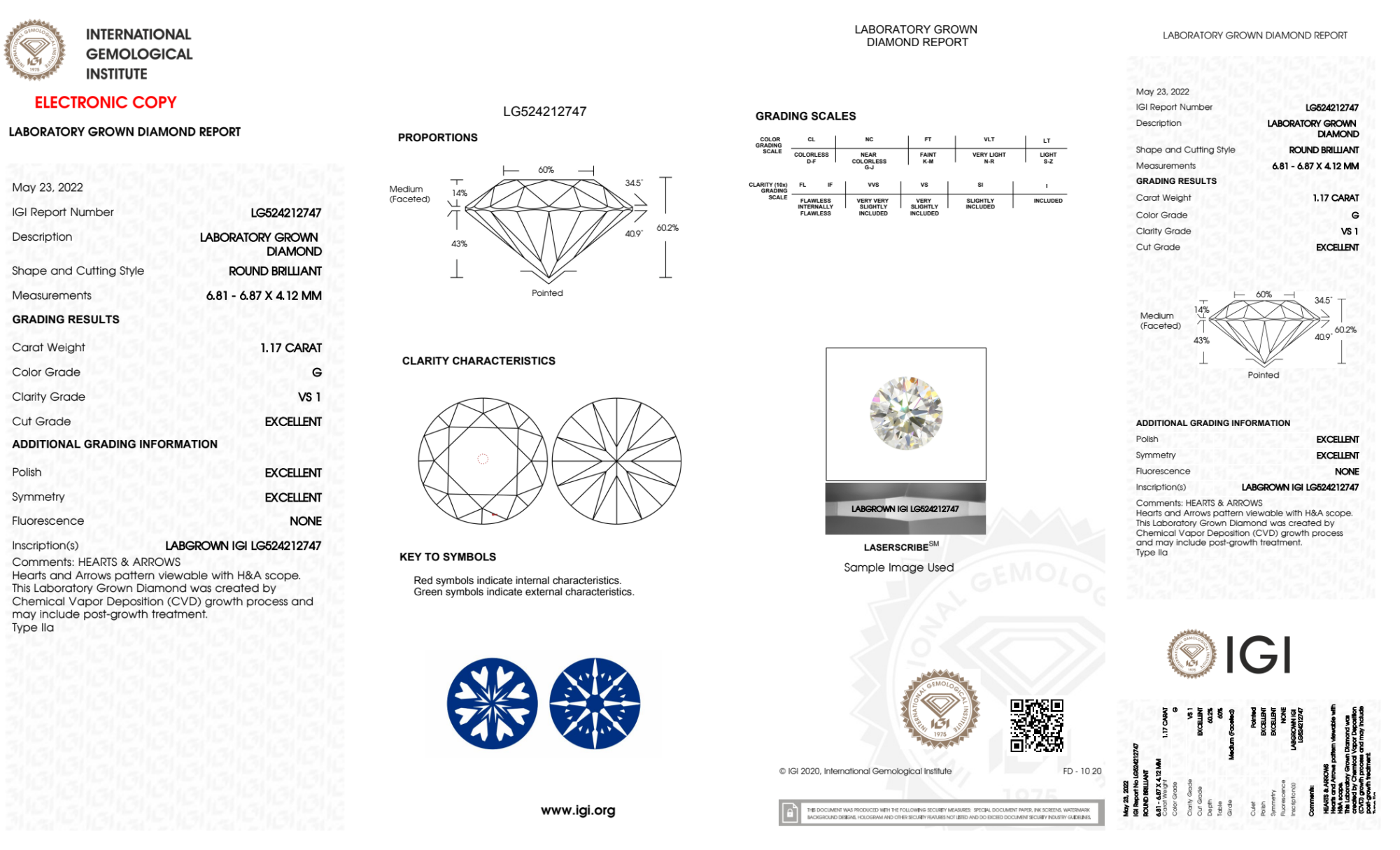 Your 1.17 carat Round lab diamond is graded G color (Near Colorless), and you can read more about G color diamonds here.