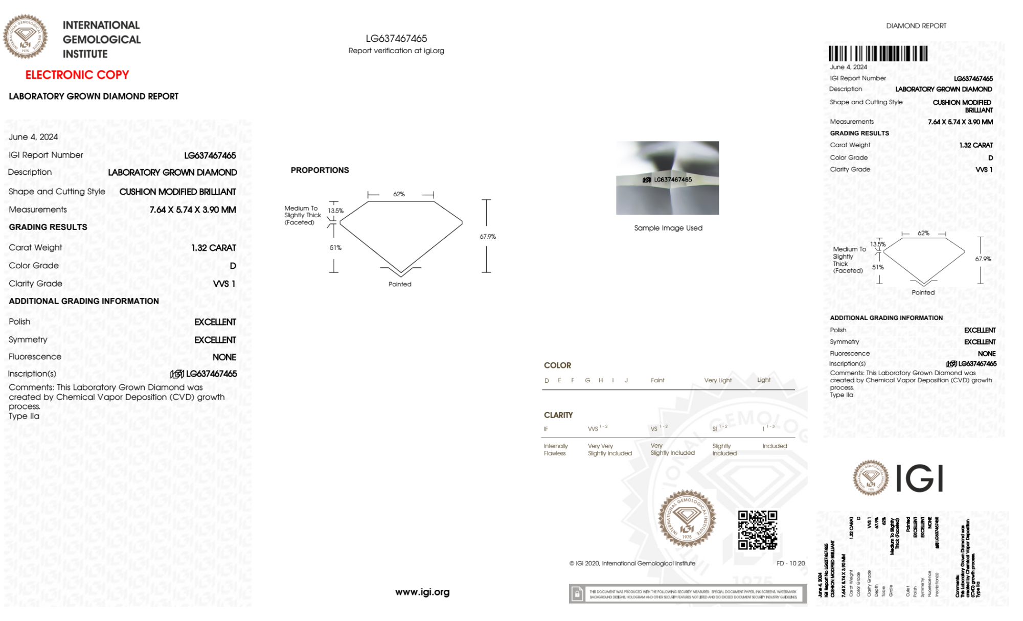 Your 1.32 carat Cushion lab diamond is graded D color (Colorless), and you can read more about D color diamonds here.