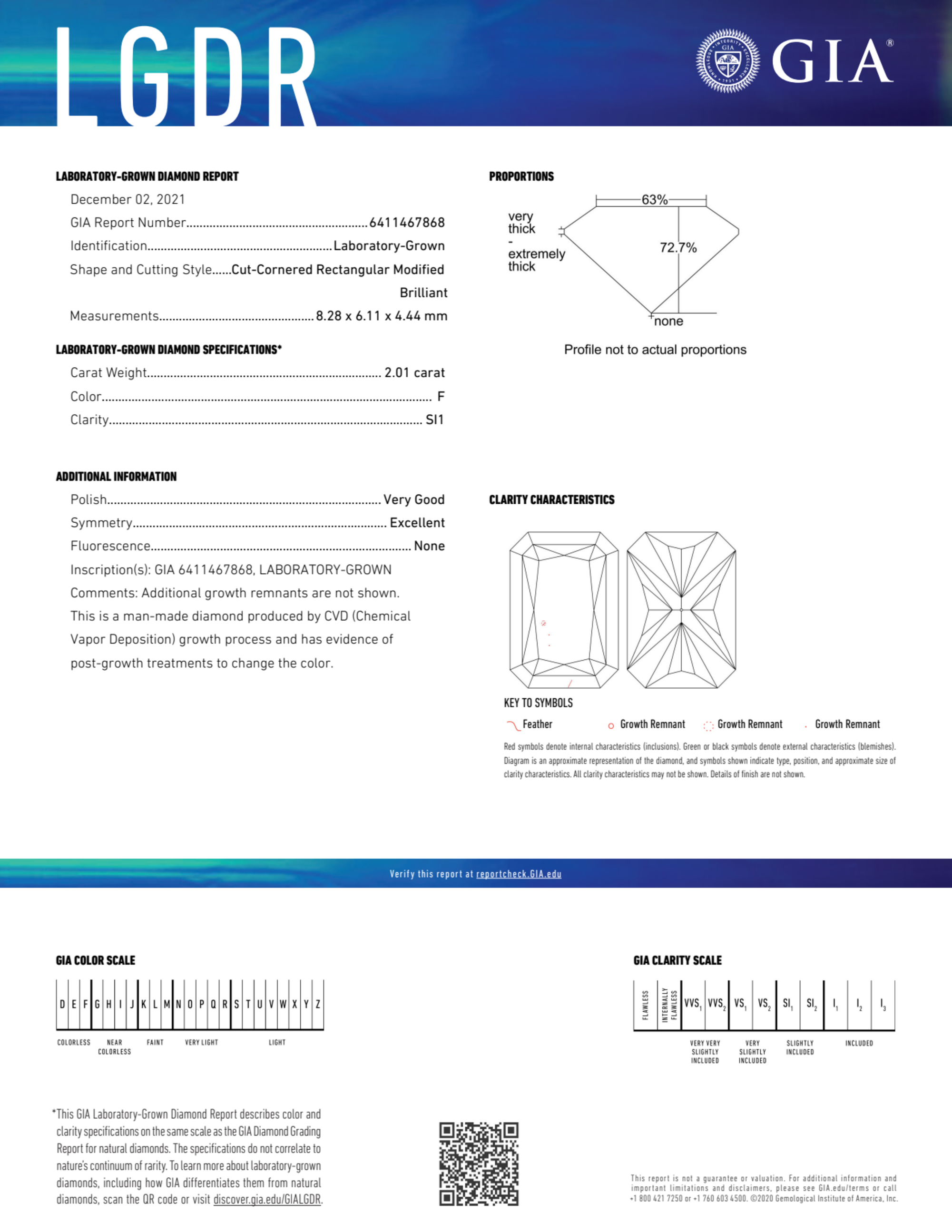 Your 2.01 carat Radiant lab diamond is graded F color (Colorless), and you can read more about F color diamonds here.