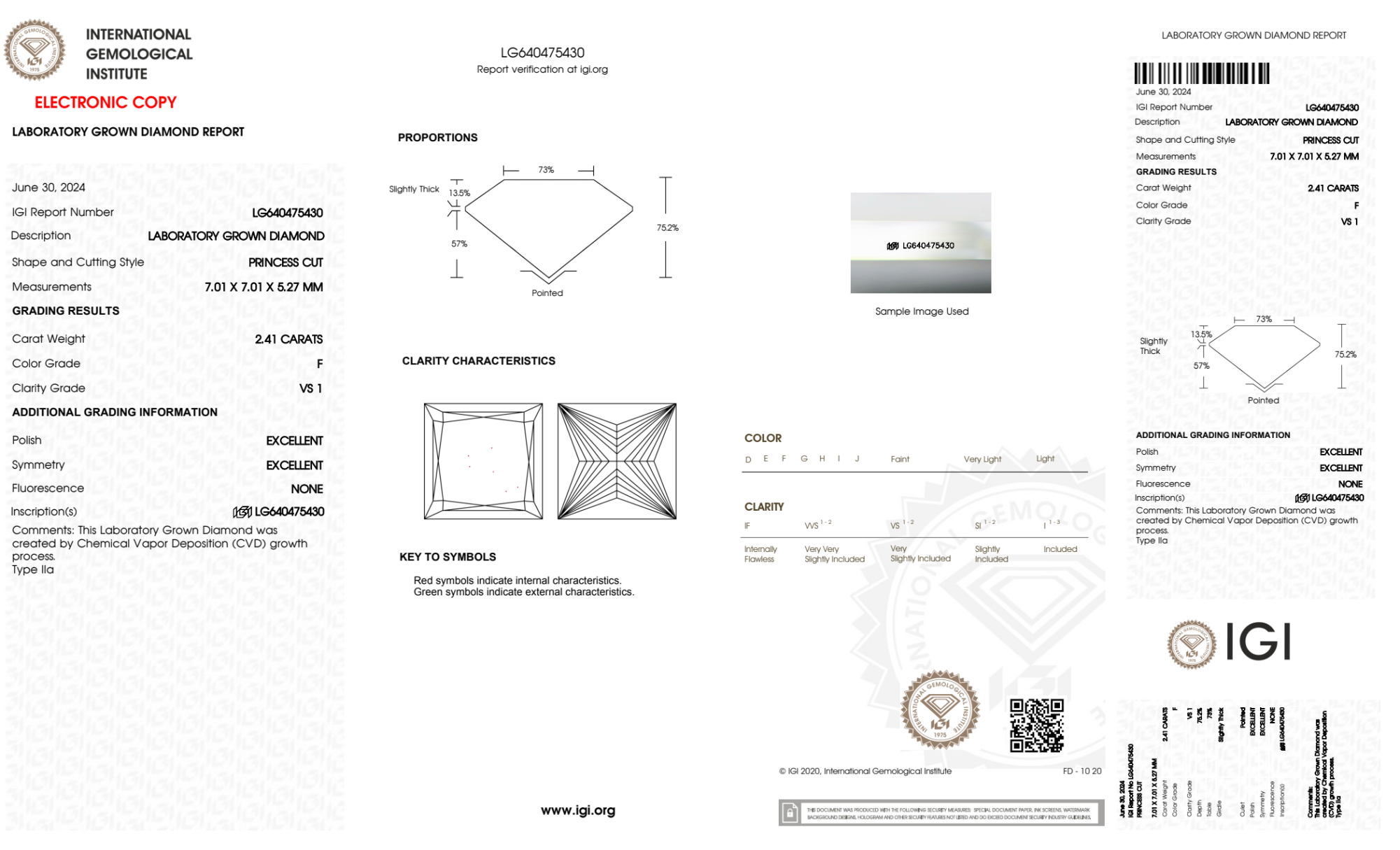 Your 2.41 carat Princess lab diamond is graded F color (Colorless), and you can read more about F color diamonds here.