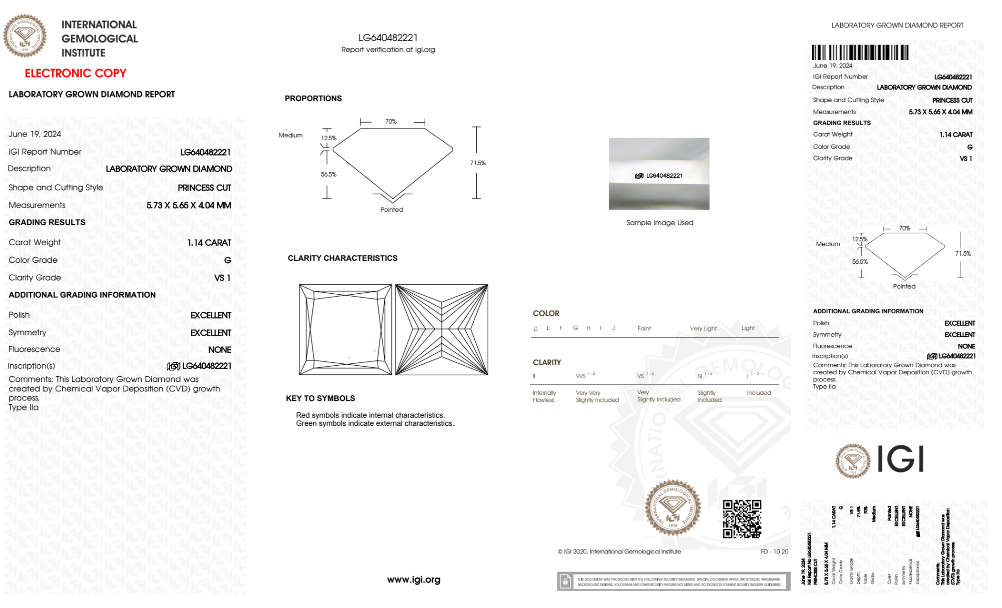 Your 1.14 carat Princess lab diamond is graded G color (Near Colorless), and you can read more about G color diamonds here.