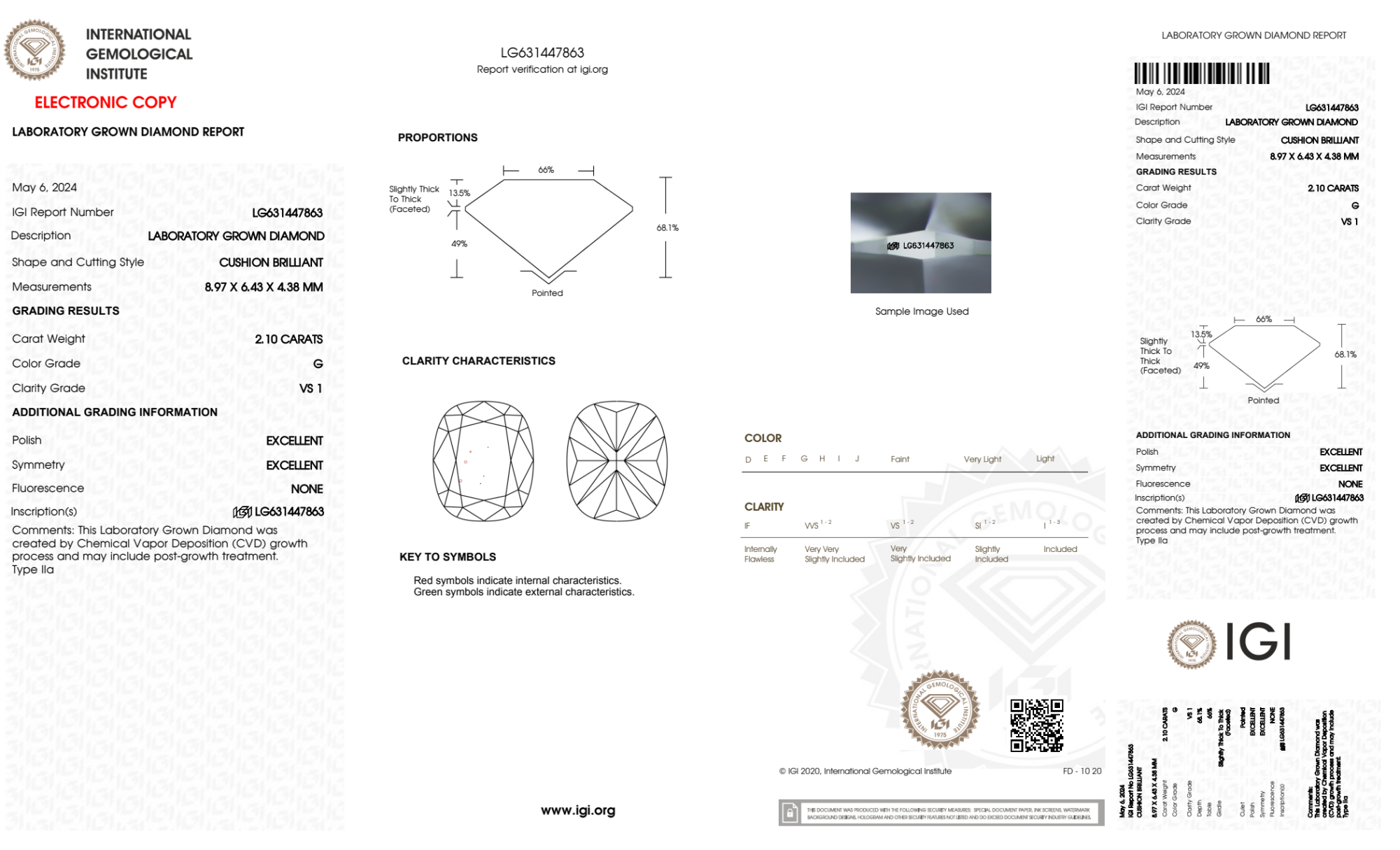 Your 2.10 carat Cushion lab diamond is graded G color (Near Colorless), and you can read more about G color diamonds here.