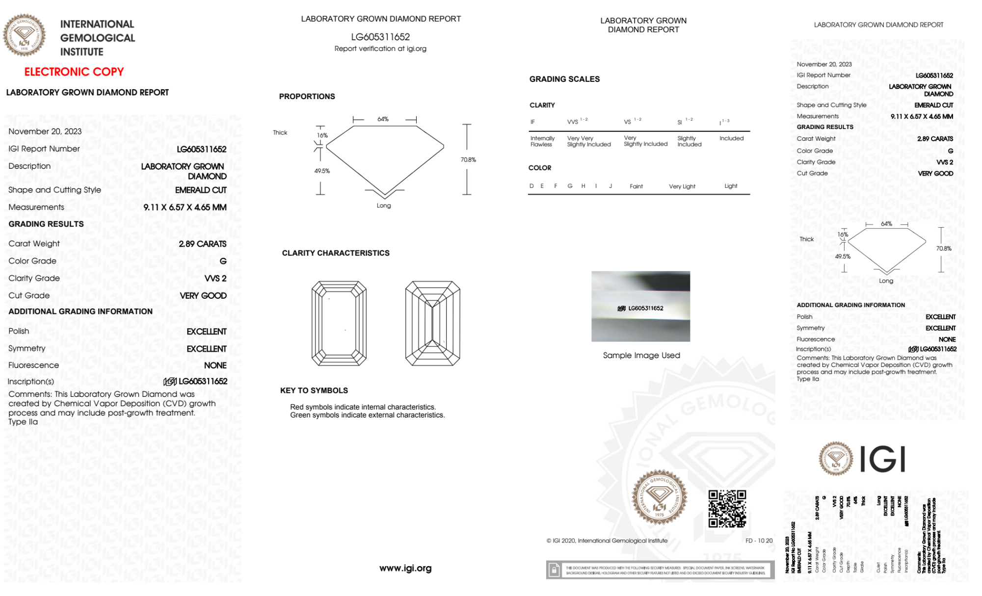 Your 2.89 carat Emerald lab diamond is graded G color (Near Colorless), and you can read more about G color diamonds here.