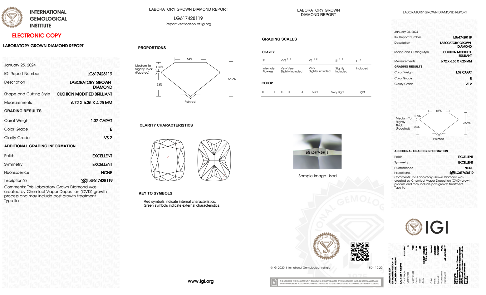 Your 1.32 carat Cushion lab diamond is graded E color (Colorless), and you can read more about E color diamonds here.