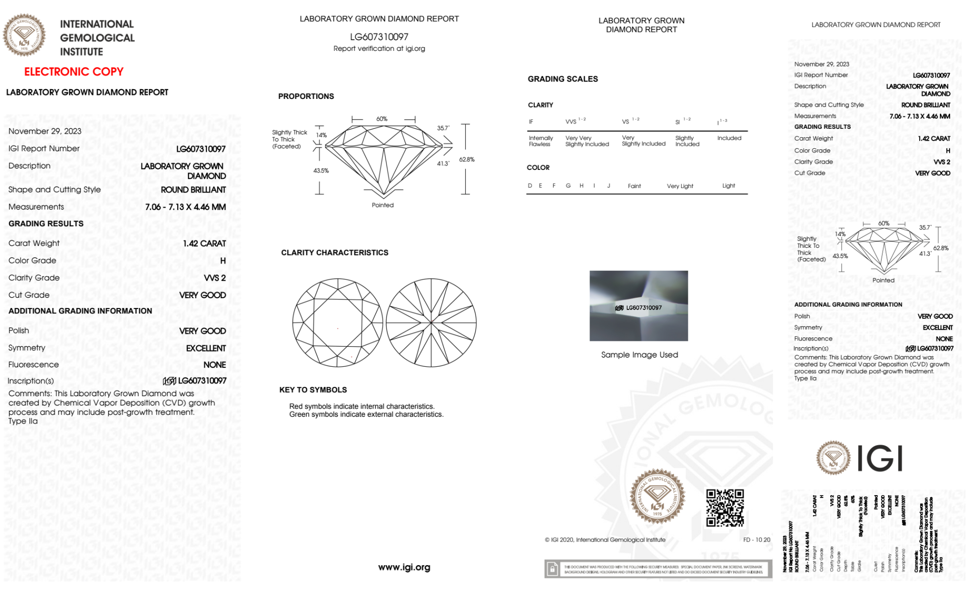 Your 1.42 carat Round lab diamond is graded H color (Near Colorless), and you can read more about H color diamonds here.