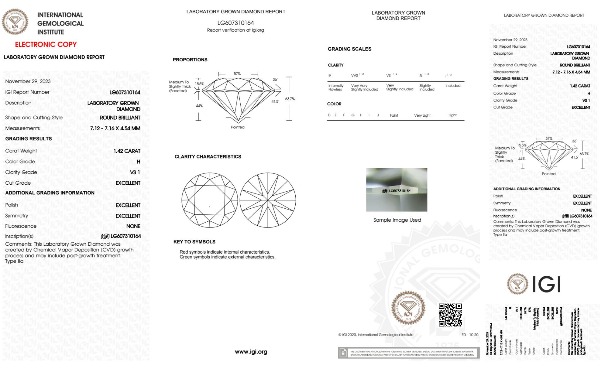 Your 1.42 carat Round lab diamond is graded H color (Near Colorless), and you can read more about H color diamonds here.