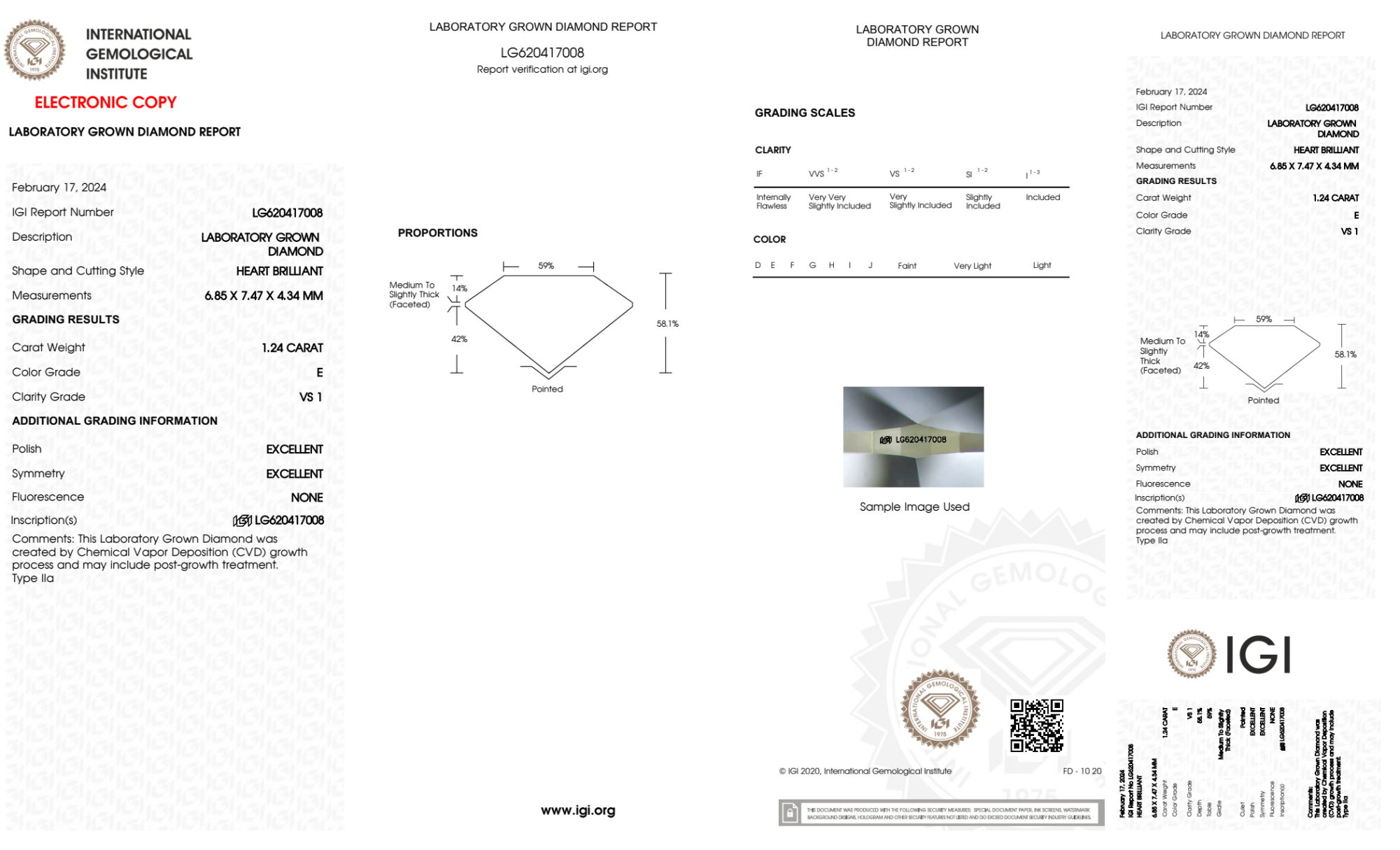 Your 1.24 carat Heart lab diamond is graded E color (Colorless), and you can read more about E color diamonds here.