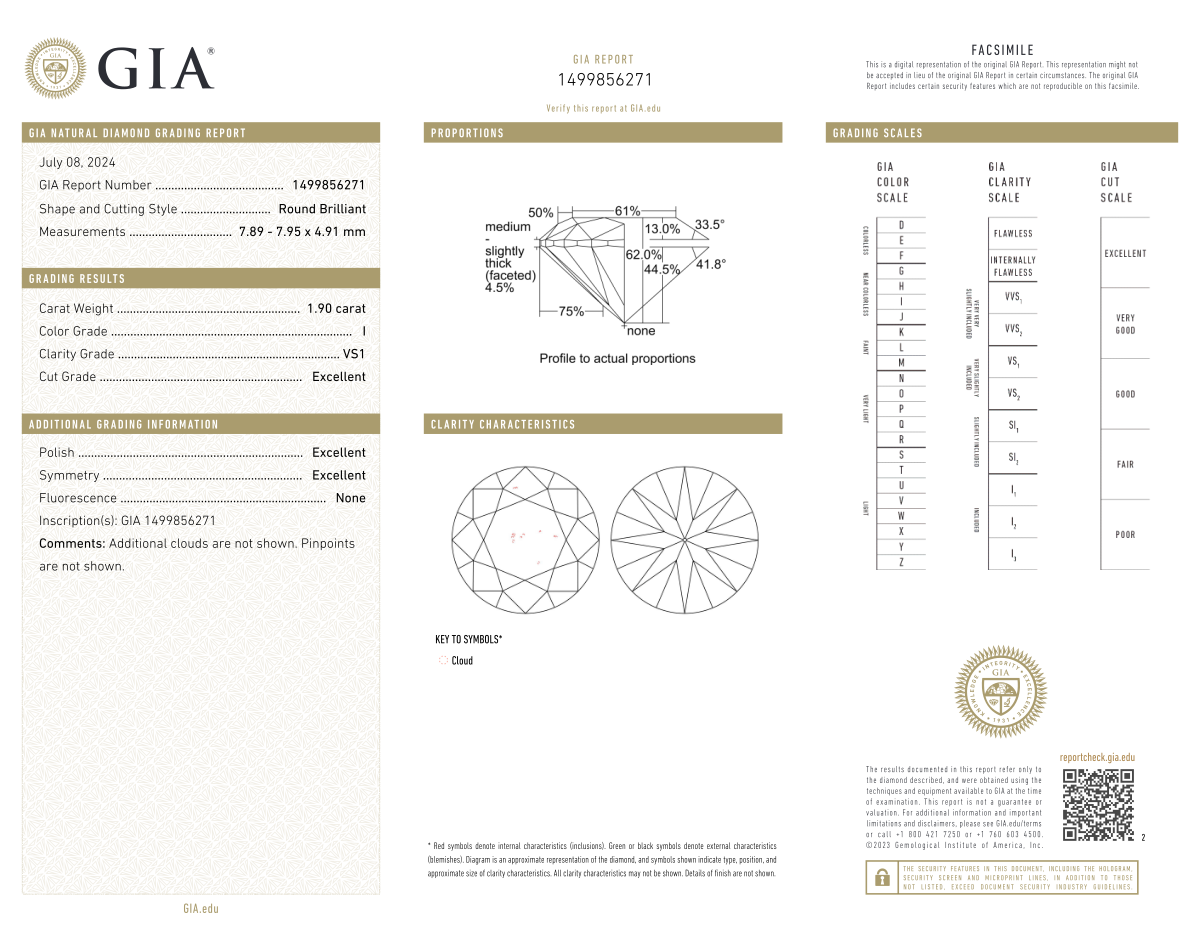 Your 1.90 carat Round natural diamond is graded VS1 clarity, which stands for Very Slightly Included 1. Read more about VS1 clarity diamonds here, or learn more about diamond clarity in general here.