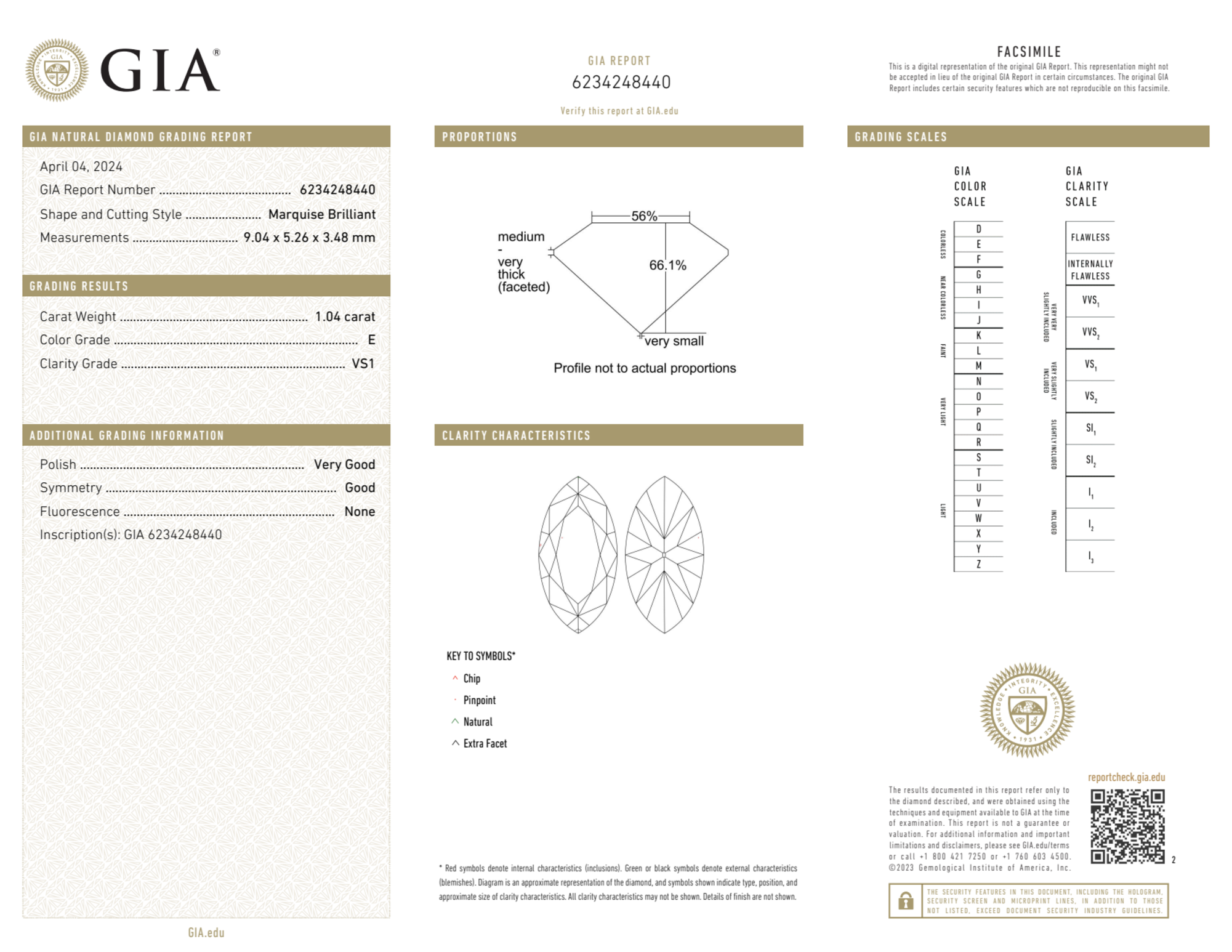 Your 1.04 carat Marquise natural diamond is graded E color (Colorless), and you can read more about E color diamonds here.