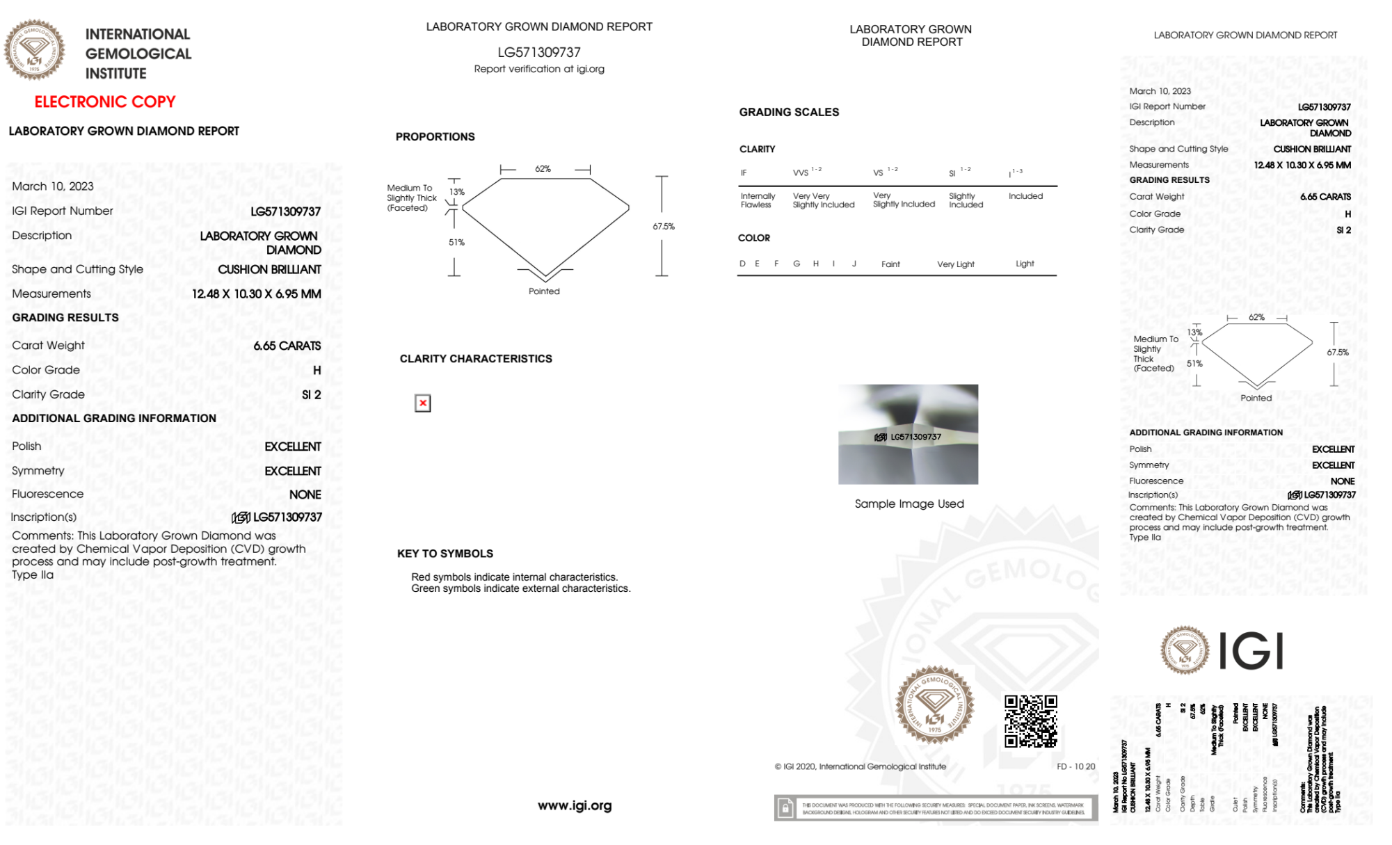 Your 6.65 carat Cushion lab diamond is graded H color (Near Colorless), and you can read more about H color diamonds here.