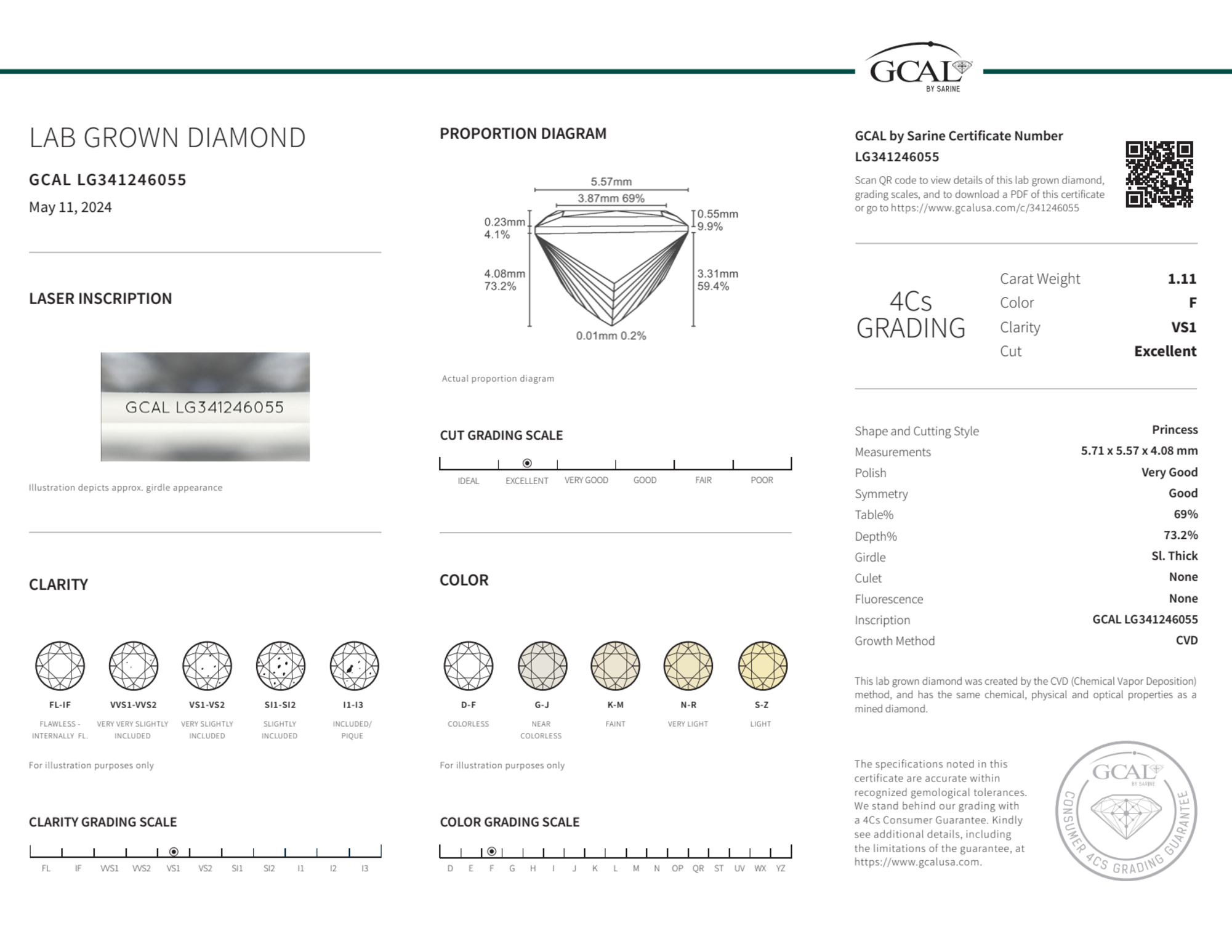 Your 1.11 carat Princess lab diamond is graded F color (Colorless), and you can read more about F color diamonds here.