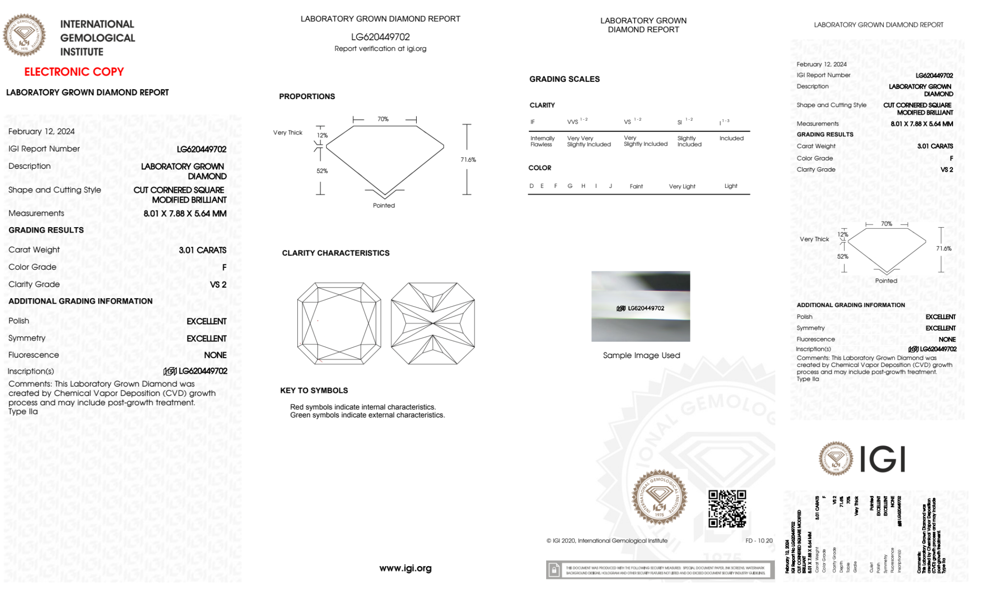 Your 3.01 carat Radiant lab diamond is graded F color (Colorless), and you can read more about F color diamonds here.