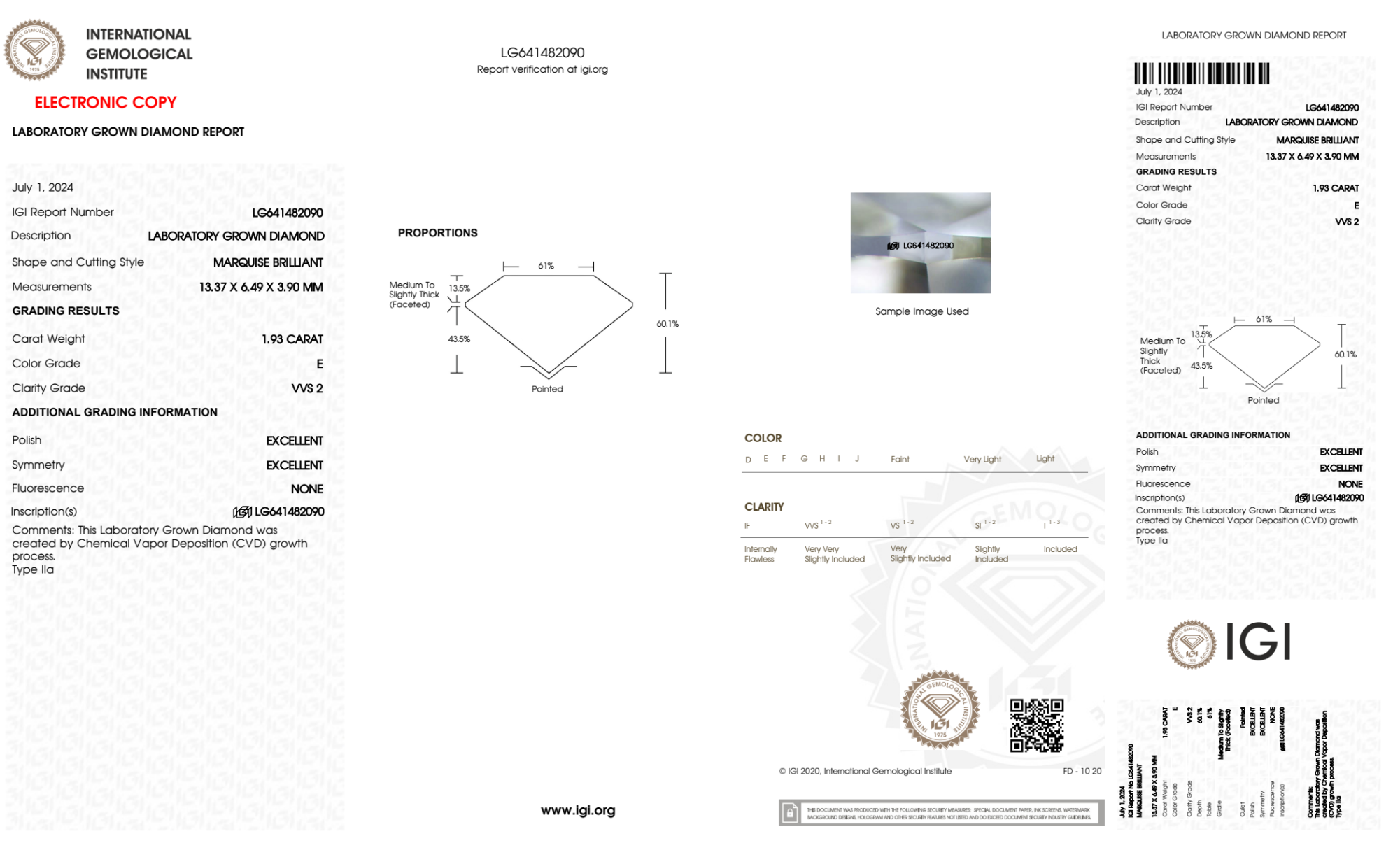 Your 1.93 carat Marquise lab diamond is graded E color (Colorless), and you can read more about E color diamonds here.
