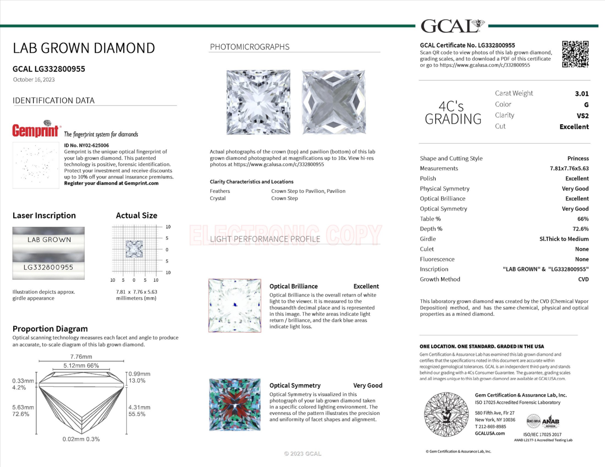 Your 3.01 carat Princess lab diamond is graded VS2 clarity, which stands for Very Slightly Included 2. Read more about VS2 clarity diamonds here, or learn more about diamond clarity in general here.