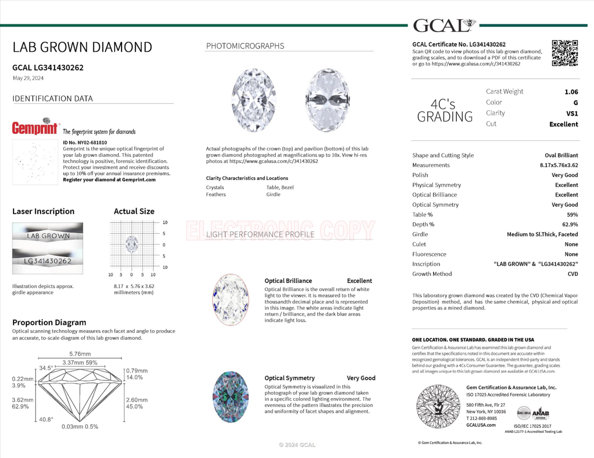 Your 1.06 carat Oval lab diamond is graded G color (Near Colorless), and you can read more about G color diamonds here.