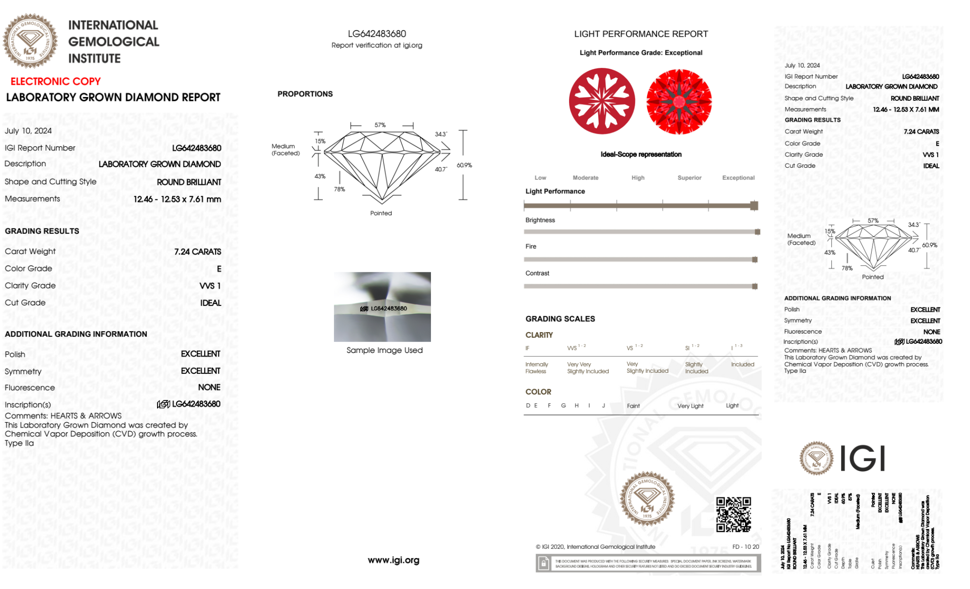 Your 7.24 carat Round lab diamond is graded E color (Colorless), and you can read more about E color diamonds here.