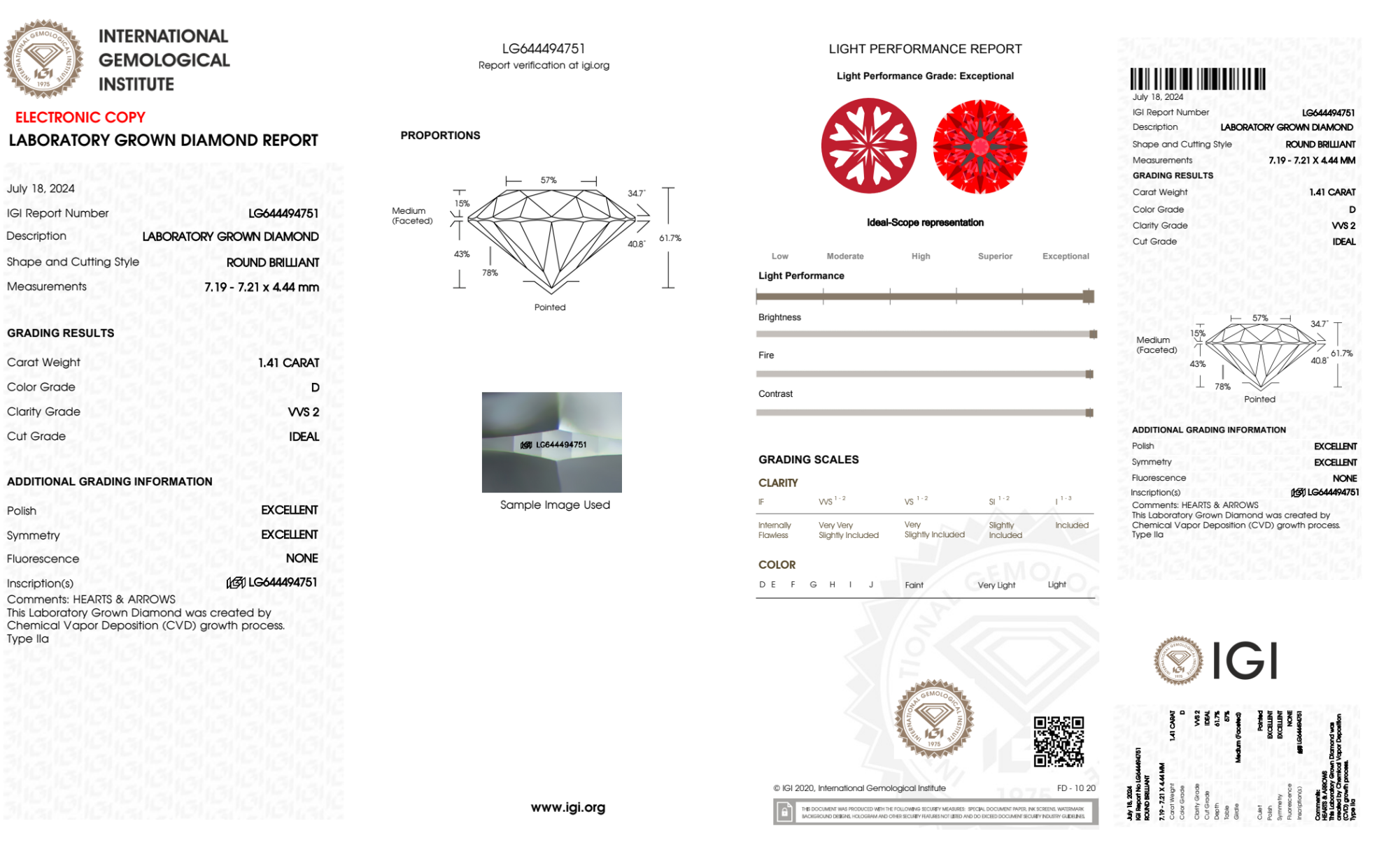 Your 1.41 carat Round lab diamond is graded D color (Colorless), and you can read more about D color diamonds here.