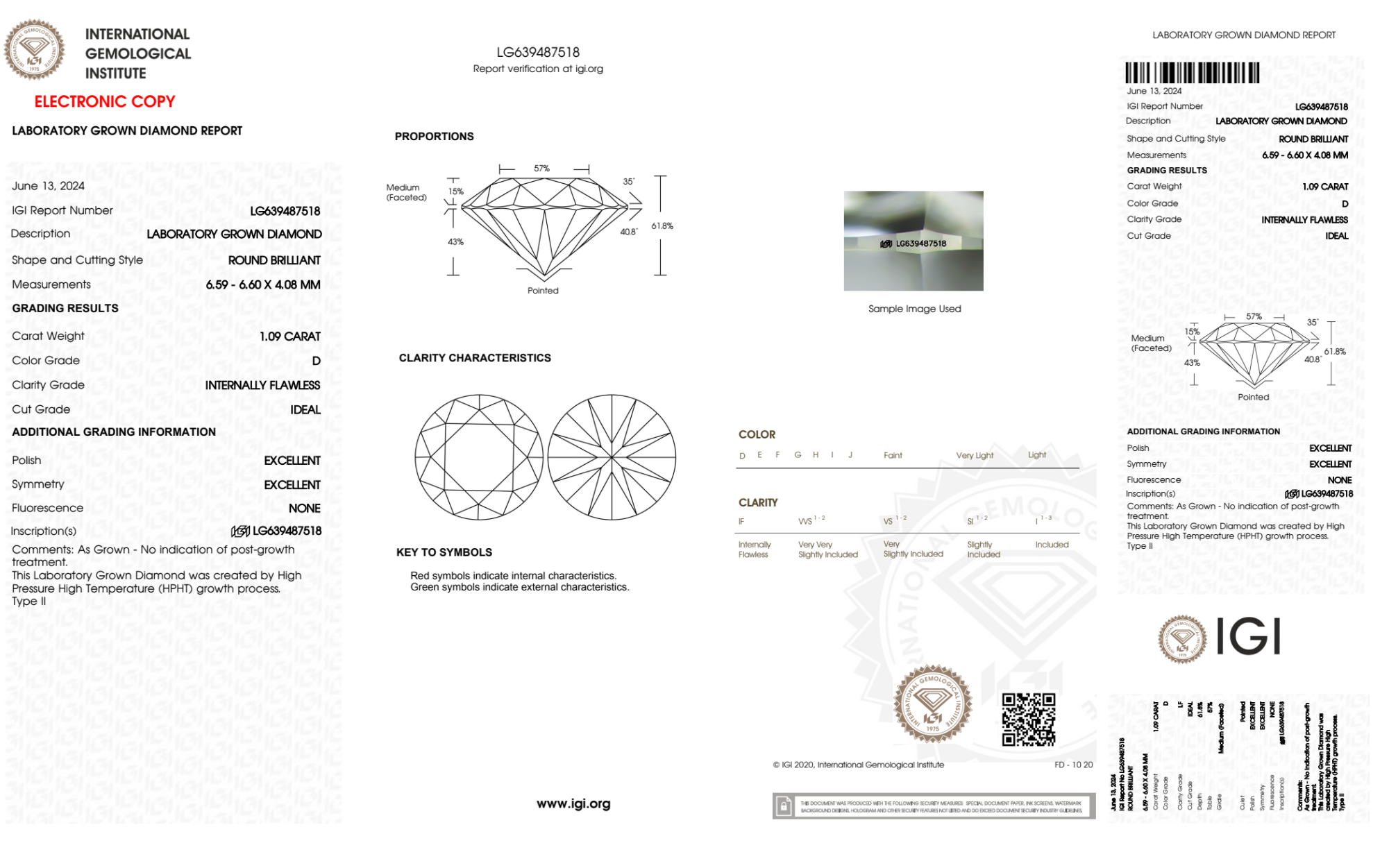 Your 1.09 carat Round lab diamond is graded IF clarity, which stands for Internally Flawless. Read more about IF clarity diamonds here, or learn more about diamond clarity in general here.