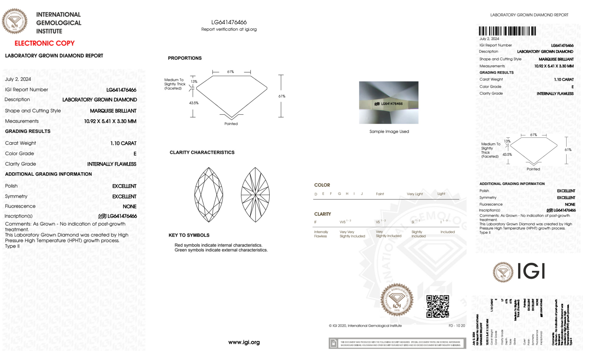 Your 1.10 carat Marquise lab diamond is graded E color (Colorless), and you can read more about E color diamonds here.