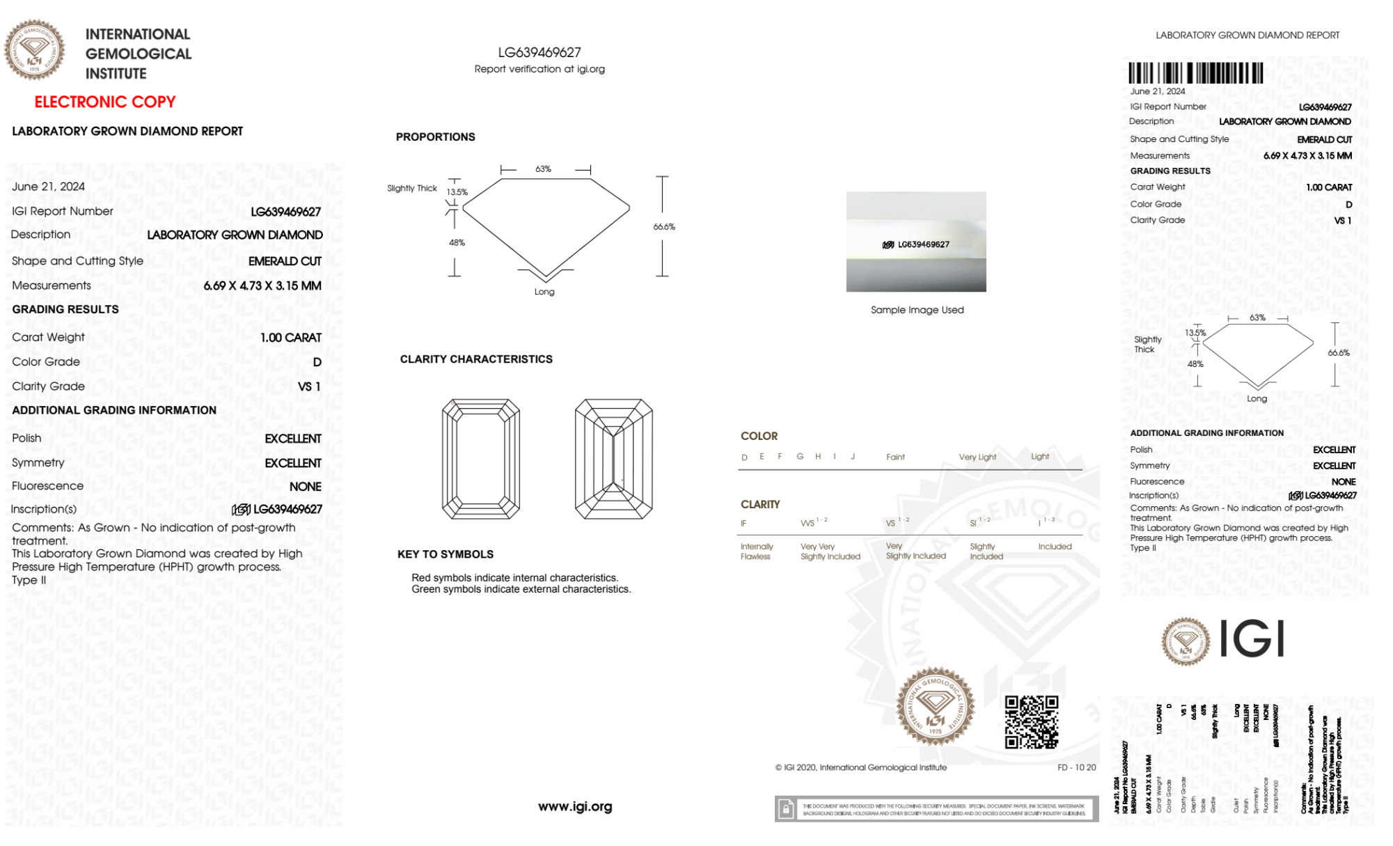 Your 1.00 carat Emerald lab diamond is graded D color (Colorless), and you can read more about D color diamonds here.
