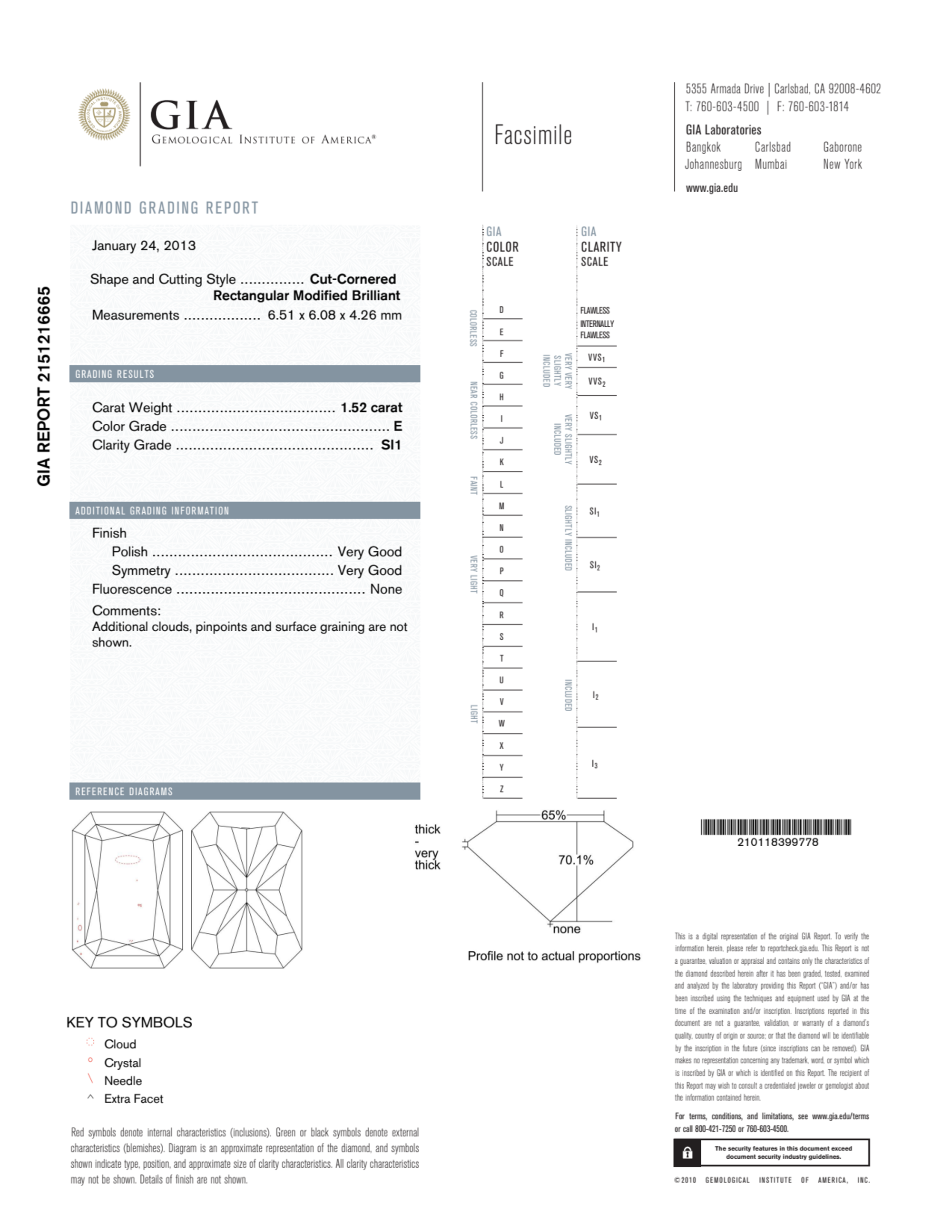 Your 1.52 carat Radiant natural diamond is graded E color (Colorless), and you can read more about E color diamonds here.