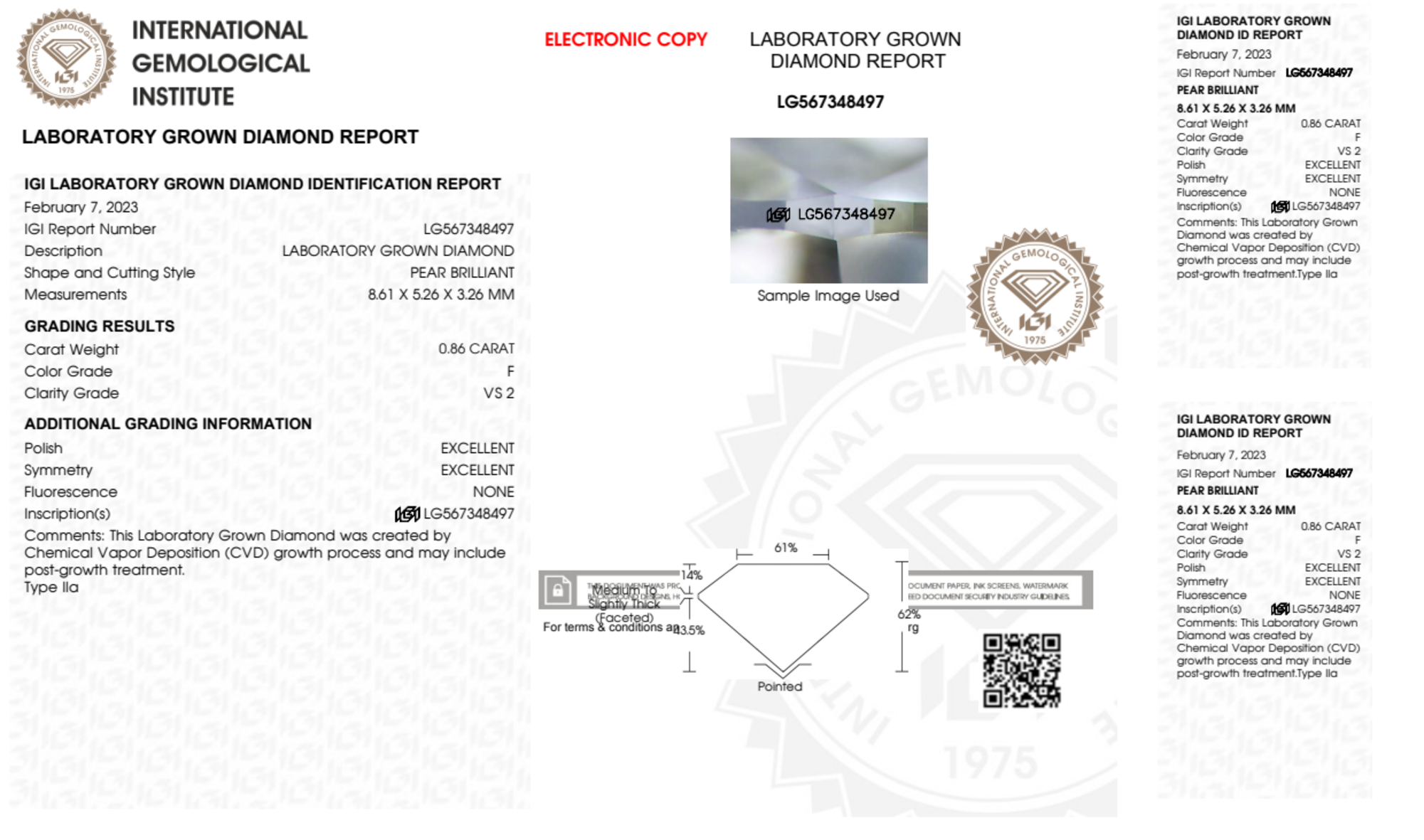 Your 0.86 carat Pear lab diamond is graded F color (Colorless), and you can read more about F color diamonds here.