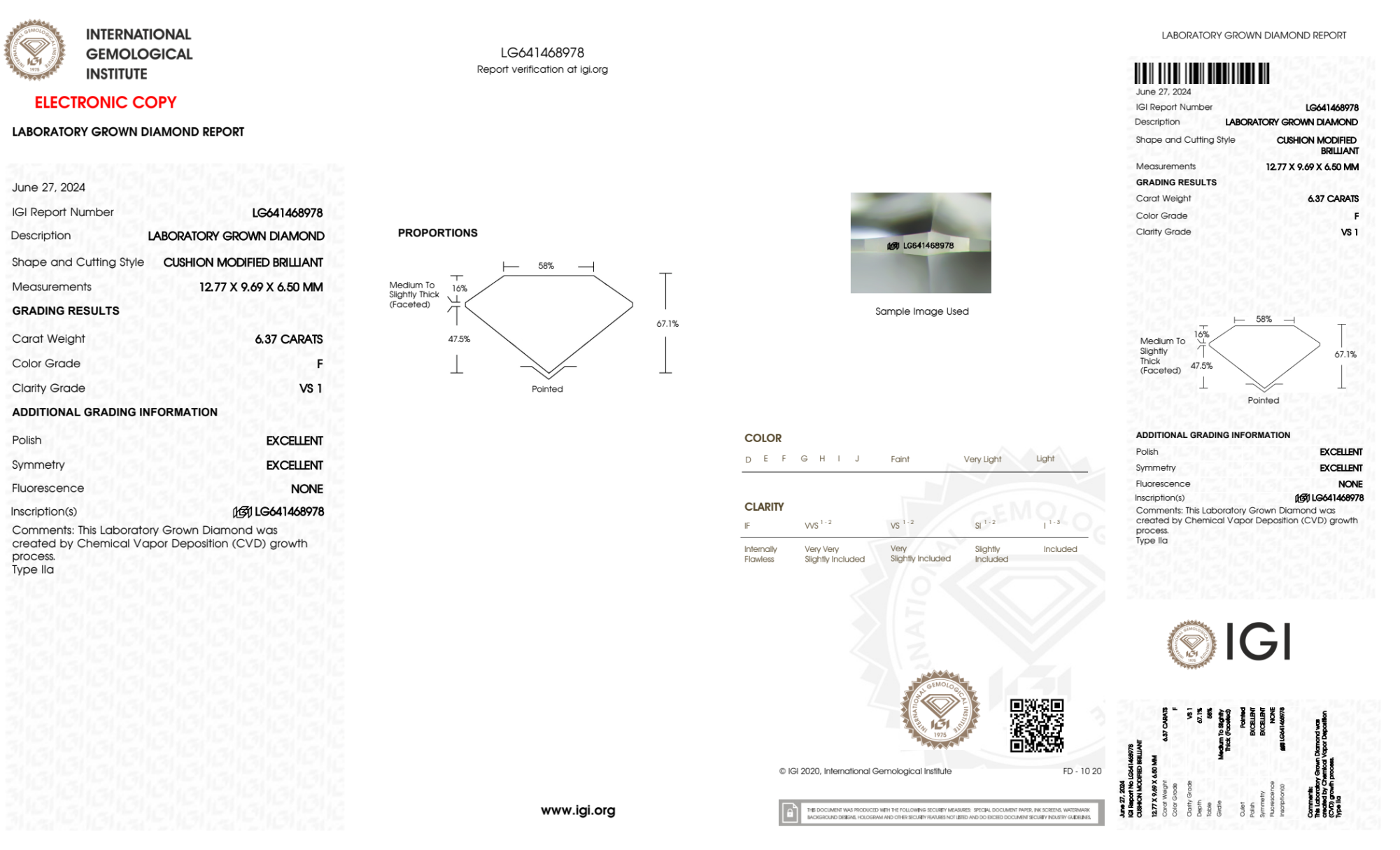 Your 6.37 carat Cushion lab diamond is graded F color (Colorless), and you can read more about F color diamonds here.