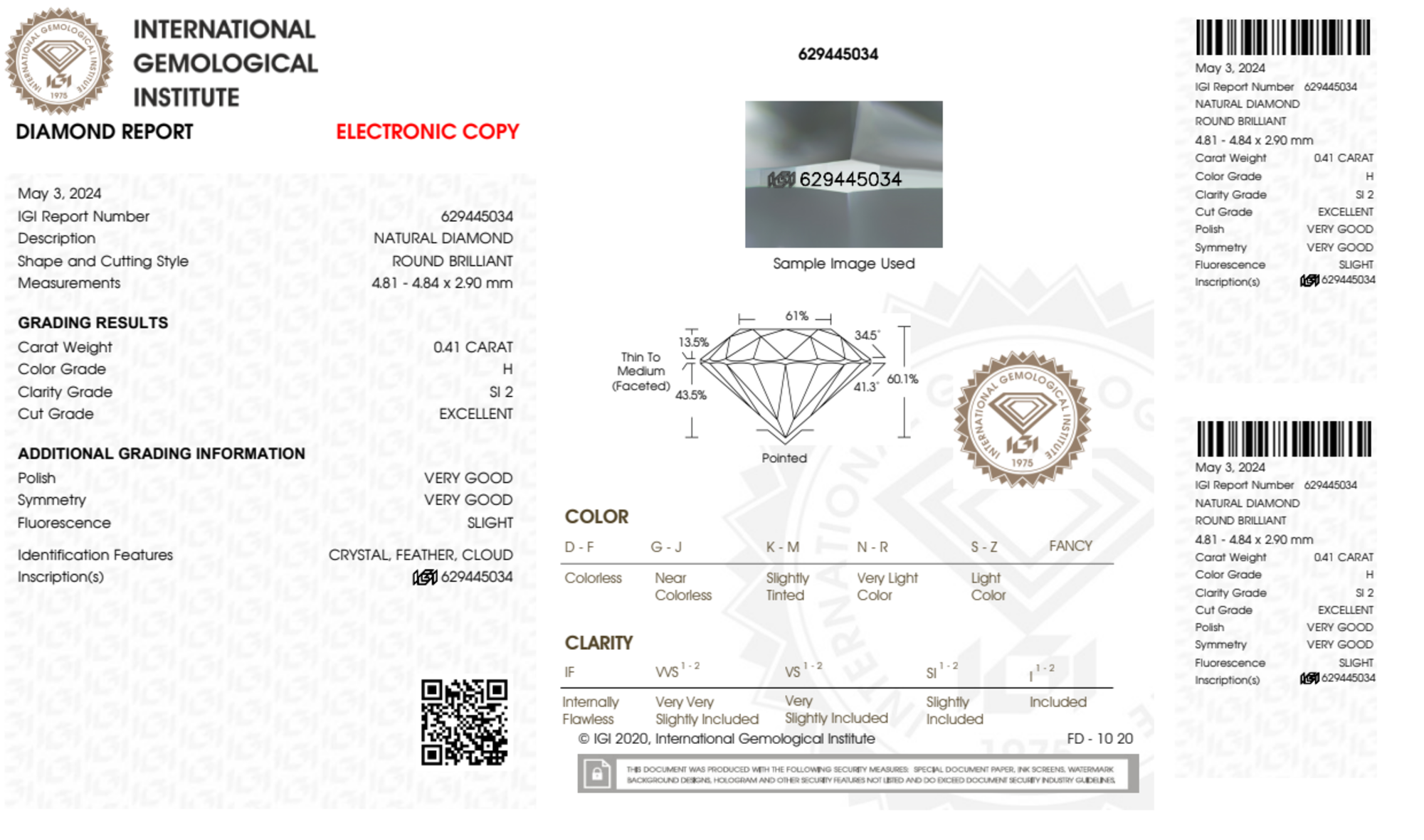Your 0.41 carat Round natural diamond is graded SI2 clarity, which stands for Slightly Included 2. Read more about SI2 clarity diamonds here, or learn more about diamond clarity in general here.