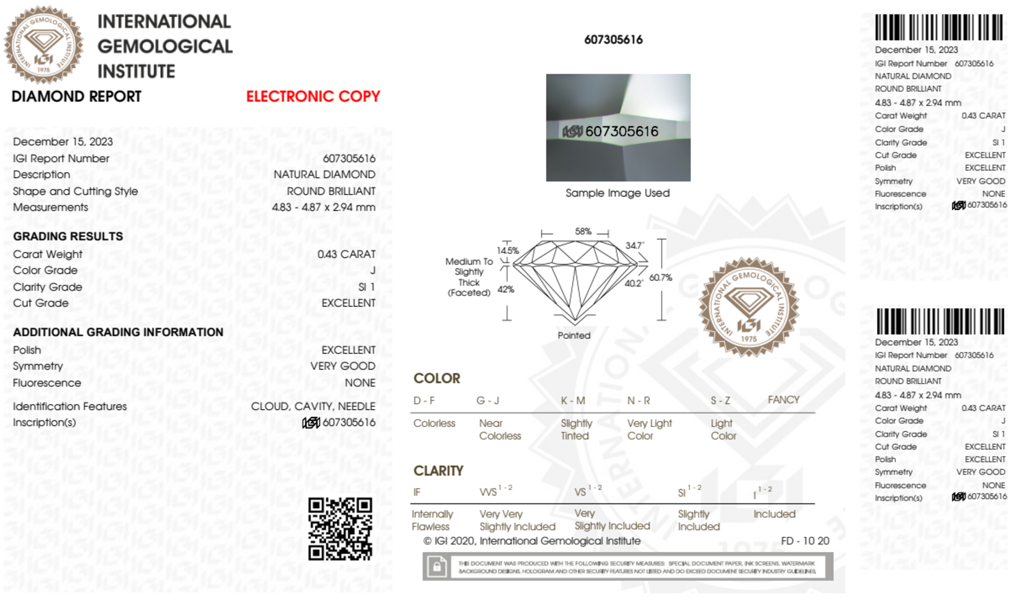 Your 0.43 carat Round natural diamond is graded SI1 clarity, which stands for Slightly Included 1. Read more about SI1 clarity diamonds here, or learn more about diamond clarity in general here.