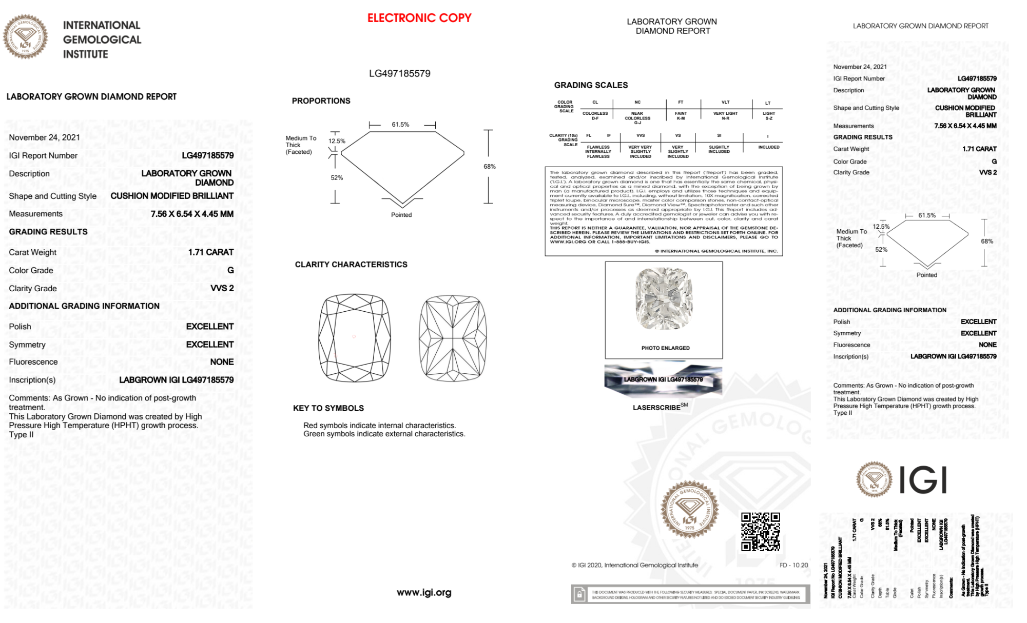 Your 1.71 carat Cushion lab diamond is graded G color (Near Colorless), and you can read more about G color diamonds here.