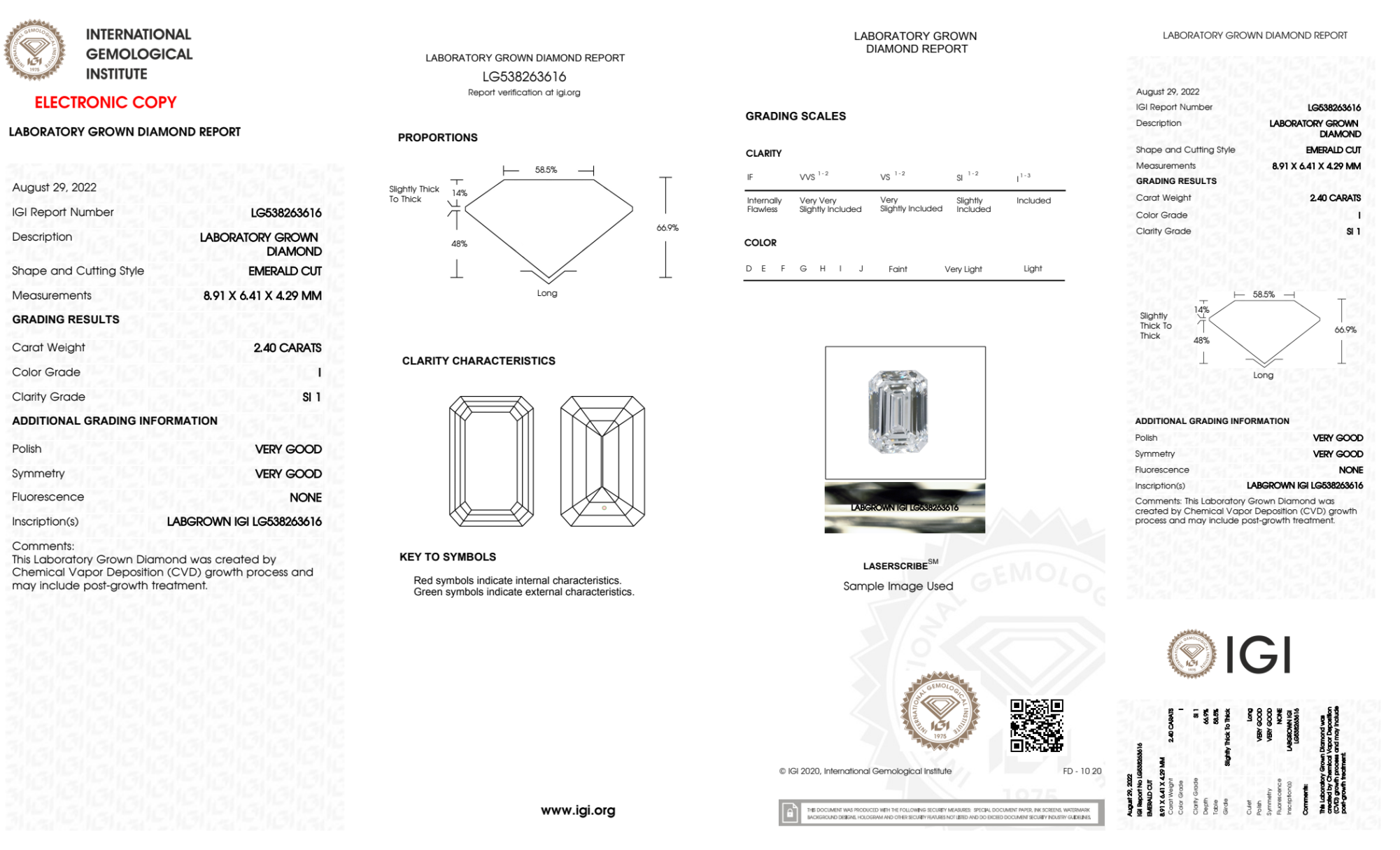 Your 2.40 carat Emerald lab diamond is graded I color (Near Colorless), and you can read more about I color diamonds here.