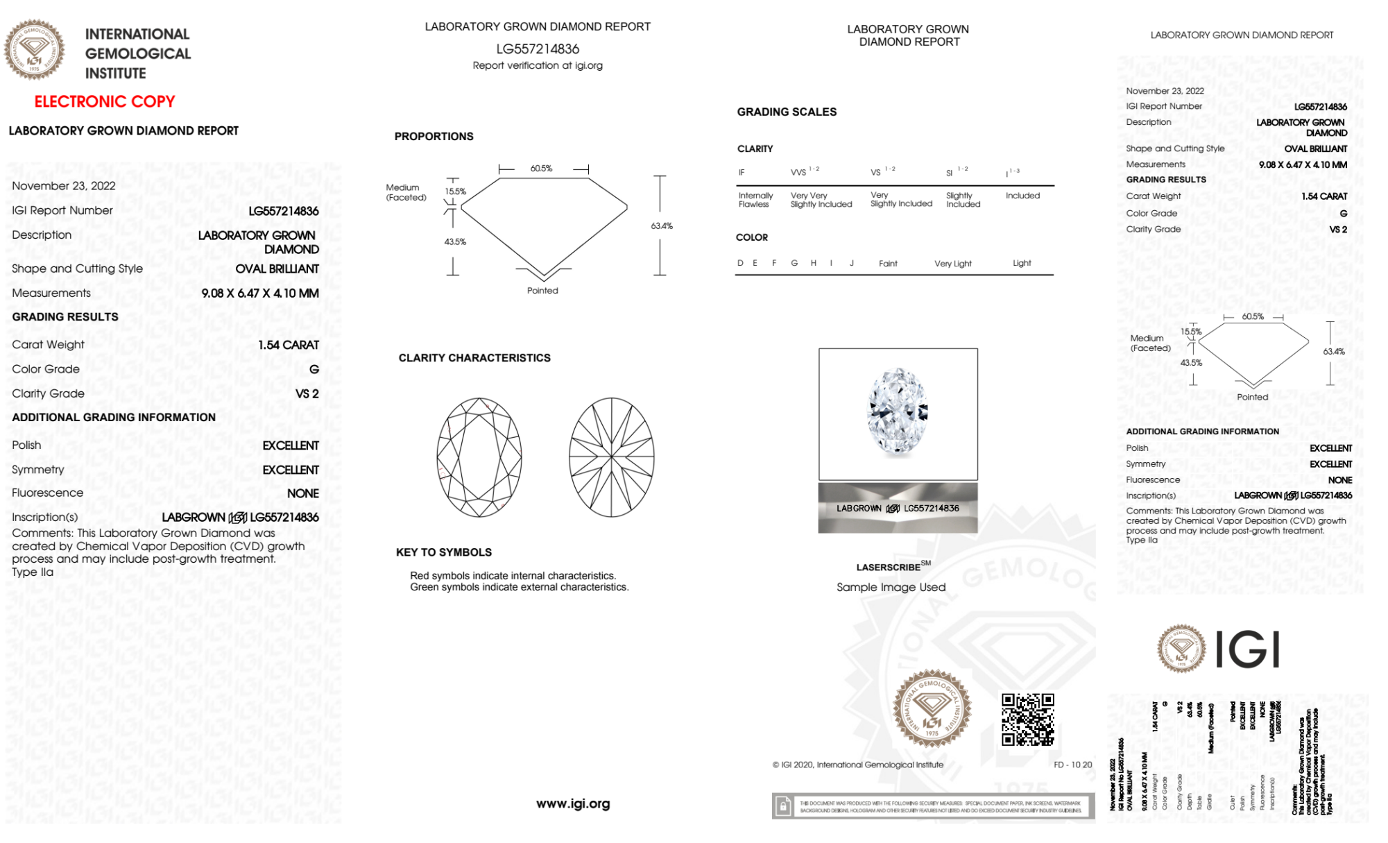 Your 1.54 carat Oval lab diamond is graded G color (Near Colorless), and you can read more about G color diamonds here.